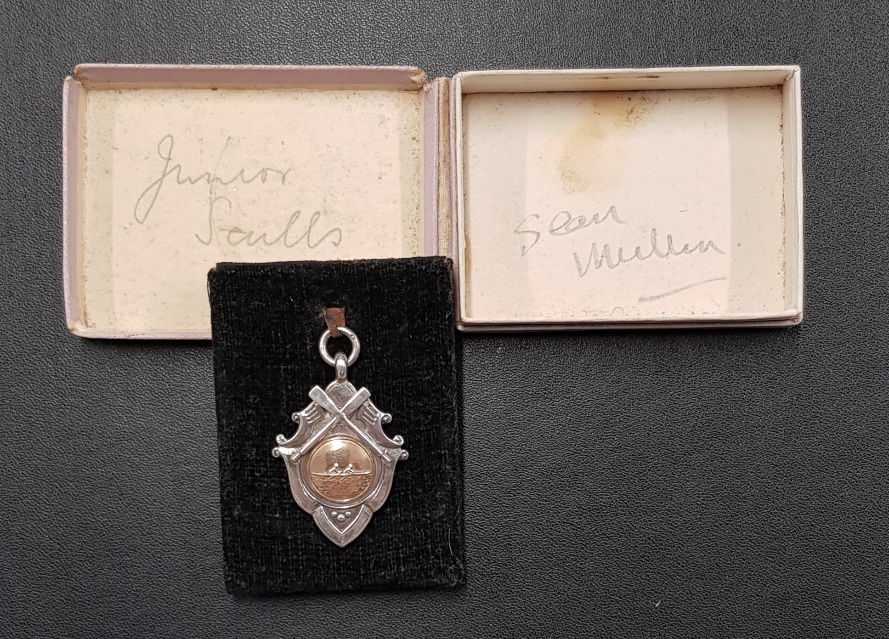 The medal in the Galway box is not engraved, but it is date stamped for 1928 and was made in Birmingham, England. Records of regatta winners of events of the principal regattas in Ireland for 1919 to 1938 are recorded in T. F. Hall’s History of Boat Racing in Ireland and the winner of Junior (now Intermediate) sculls for Galway Regattas of 1928 and 1929 respectively are Dublin Rowing Club and Galway Commercial. Mullin is a Connaught name and Galway is the principal city in the province, so perhaps Sean Mullin won the Junior Sculls at Galway Regatta in 1929? Or perhaps not.