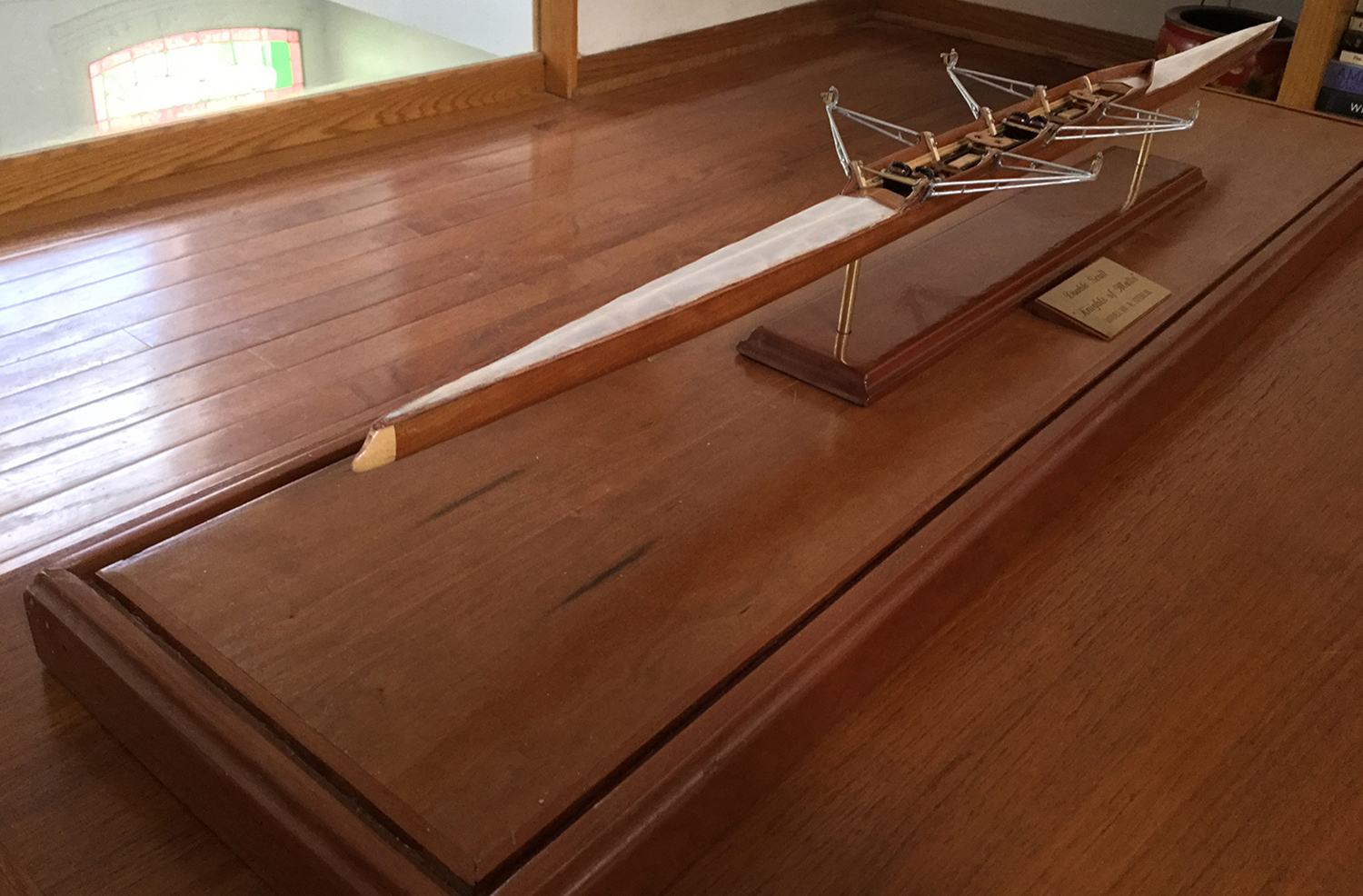 [The model’s] history is a bit murky. I have been a member of the club for over 50 years. One day out of the blue, many years ago, I got a phone call at the club from a guy in California. He said that he and the family were cleaning out their father’s garage and discovered this model and thought it might belong to us since it had our name on the bow. He did not identify himself, but said he would send it to us. I said sure, and soon it appeared on the club’s door step. The model had no base, many of the riggers were bent, the rudder missing and only two oars of what I thought were a set of eight. I restored it as best I could, and it is has been proudly displayed at the club ever since. We have always wondered as to its provenance and if it ever belonged to the club earlier in our history.