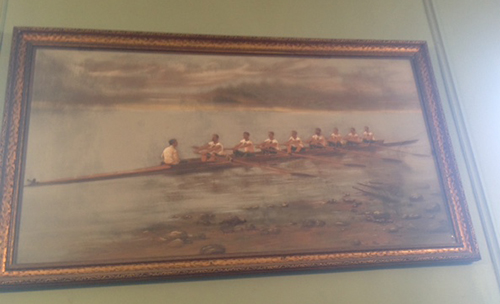 We think it is representative on an eight shown in a painting we have hanging above the model, but do not know its exact age or who made it. The theory in Bill Miller’s article that I came across on HTBS, and the picture of the gentleman holding an eight model, does lend credence to the idea that it might have been produced by a boat manufacturer at the time. I have discovered that in Philadelphia around the turn of the 20th century there was a very busy manufacturer of shells called William Glass and Sons. We have found receipts from him in the club’s archives.