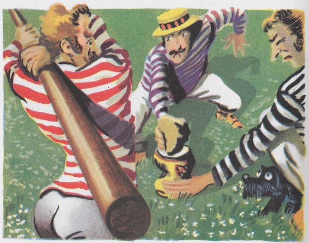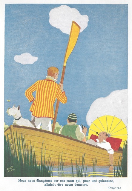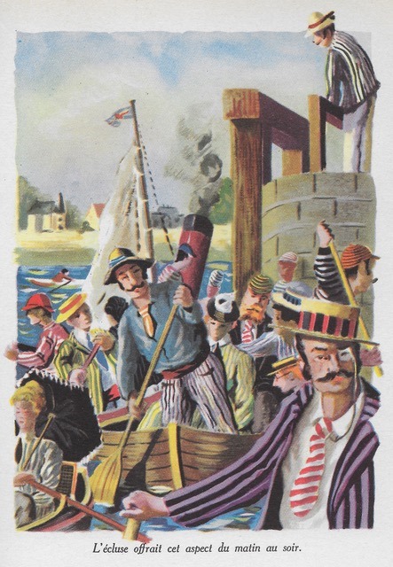 The French Bibliothèque Rouge et Or edition of 1953 has very fine illustrations by Émile Folliette, including this one of logjam at the lock. Take your pick of which lock – there is a hint of an oast house in the background. Is there such a thing twixt Kingston and Oxford? Or is it a church?