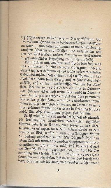 Diana’s collection includes an attractive edition for Goths that concentrates the imagination by avoiding illustration altogether – with the exception of the cover, where George, Harris and Jerome appear much too cheerful for the genre. It is typeset in what looks like Bertholdr Mainzer Fraktur in eye-straining small point size, all of 207 Goth-packed pages.