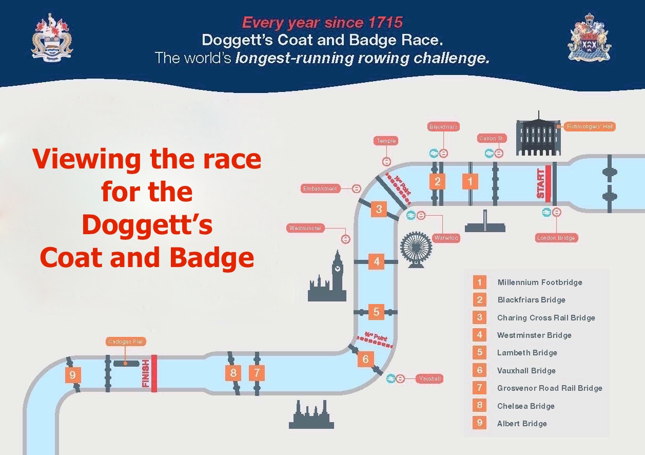 The 304th Doggett’s Coat and Badge Wager, sponsored by Tideway London, starts at 4.00 at London Bridge and should finish less than 30 minutes later at Cadogan Pier, Chelsea. Due to building work at Fishmongers’ Hall, this year the presentation to the winner will be held on Cadogan Pier.