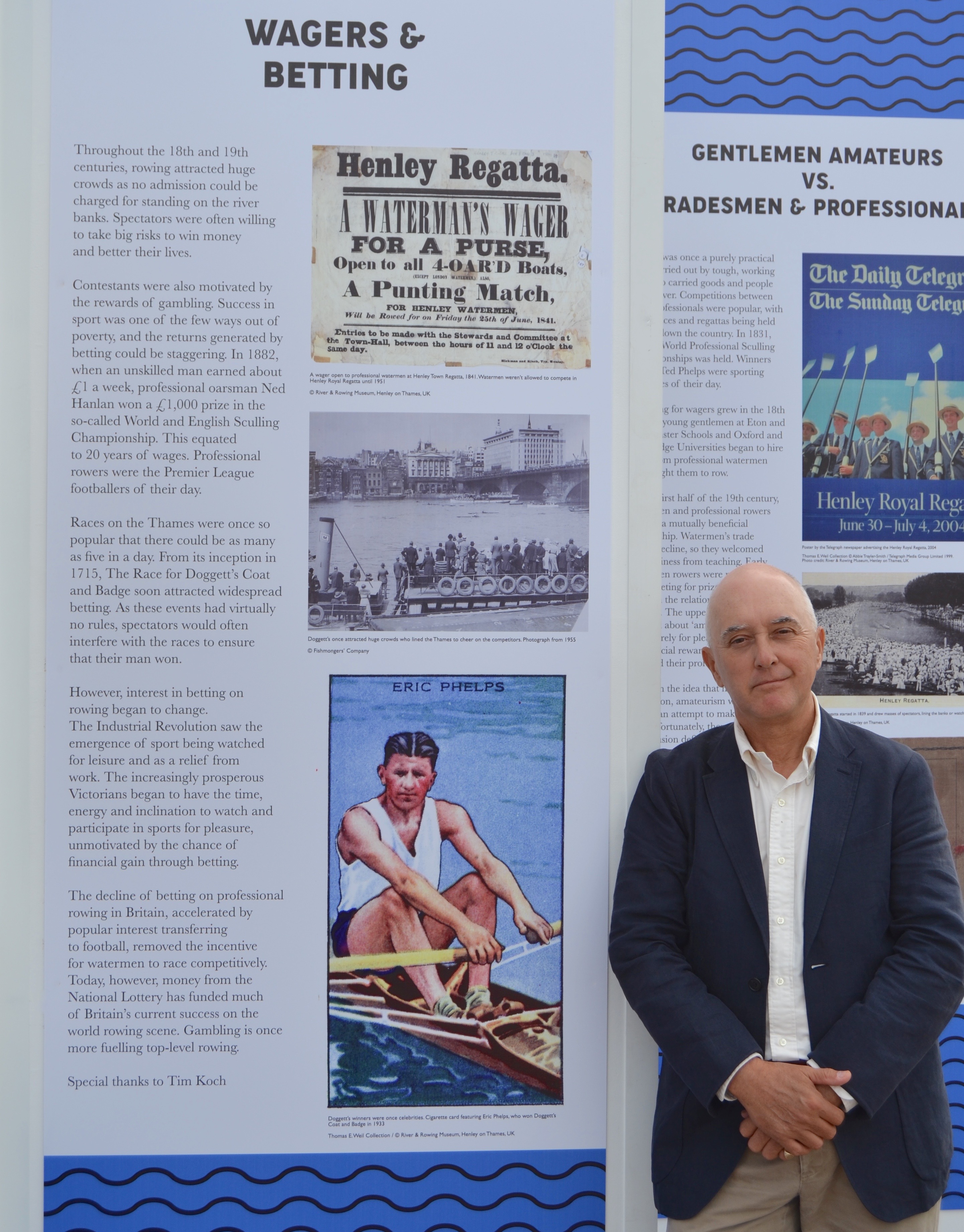 In recent times, the word ’curate’ used as a verb has become very popular, usually applied by the young to any activity that involves selecting a few things and putting them together in the same place. However, those who have produced The World’s Oldest Boat Race exhibition each deserve the title ‘curator’ as used in its traditional, more distinguished sense. I think that the exhibition will be of interest both to passing members of the public (which must be the top priority given the nature of the display) and to those with a more specific interest in the subject matter – even HTBS Types. Credit must go to curators Jen Kavanagh and Eva Tausig, designer Helen Ralli and photographer Hydar Dewachi. I have to declare an interest here, I was consulted about much of the text and I produced the ‘uncurated’ versions of ‘Gentlemen Amateurs vs Tradesmen and Professionals’ and ‘Wagers and Betting’.
