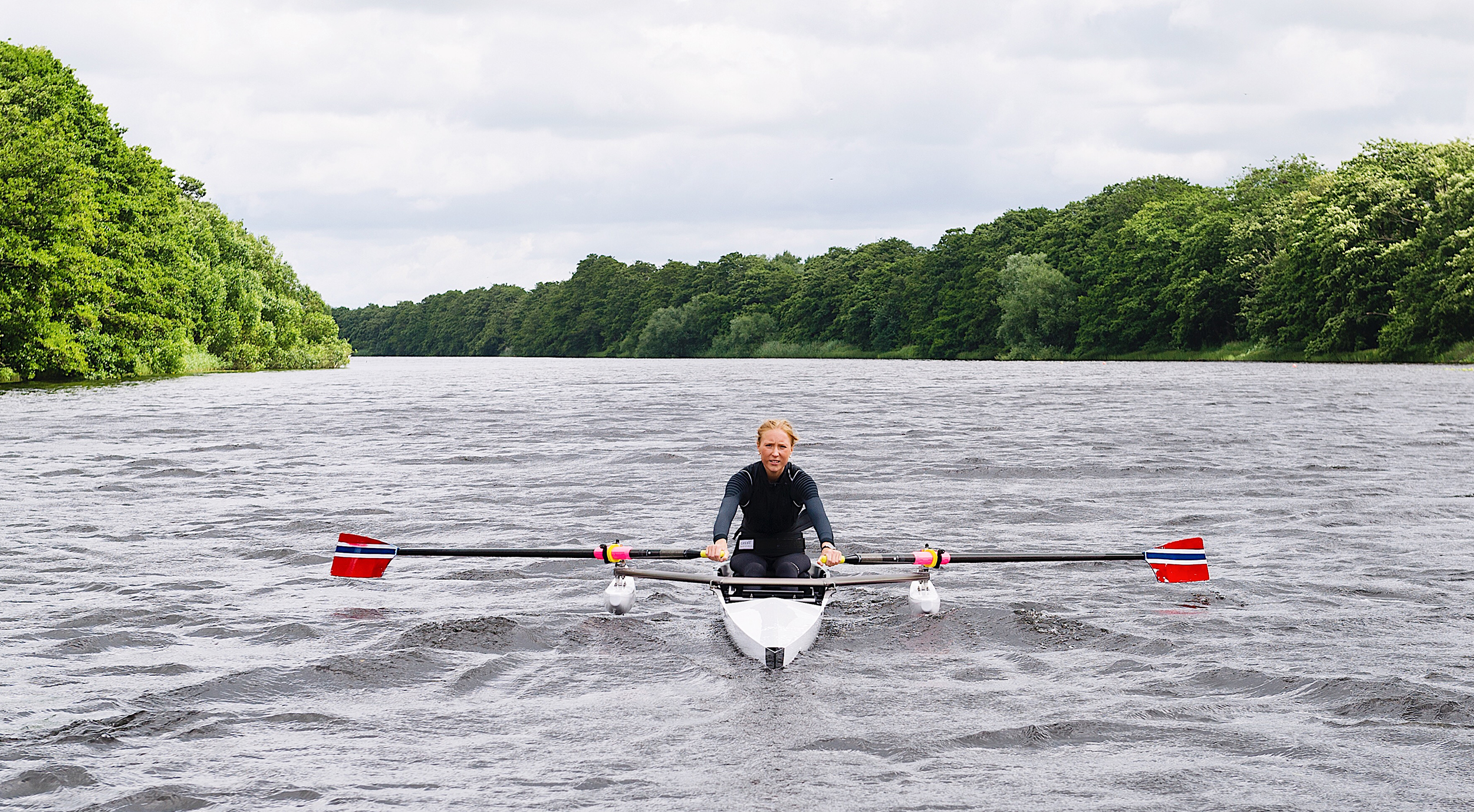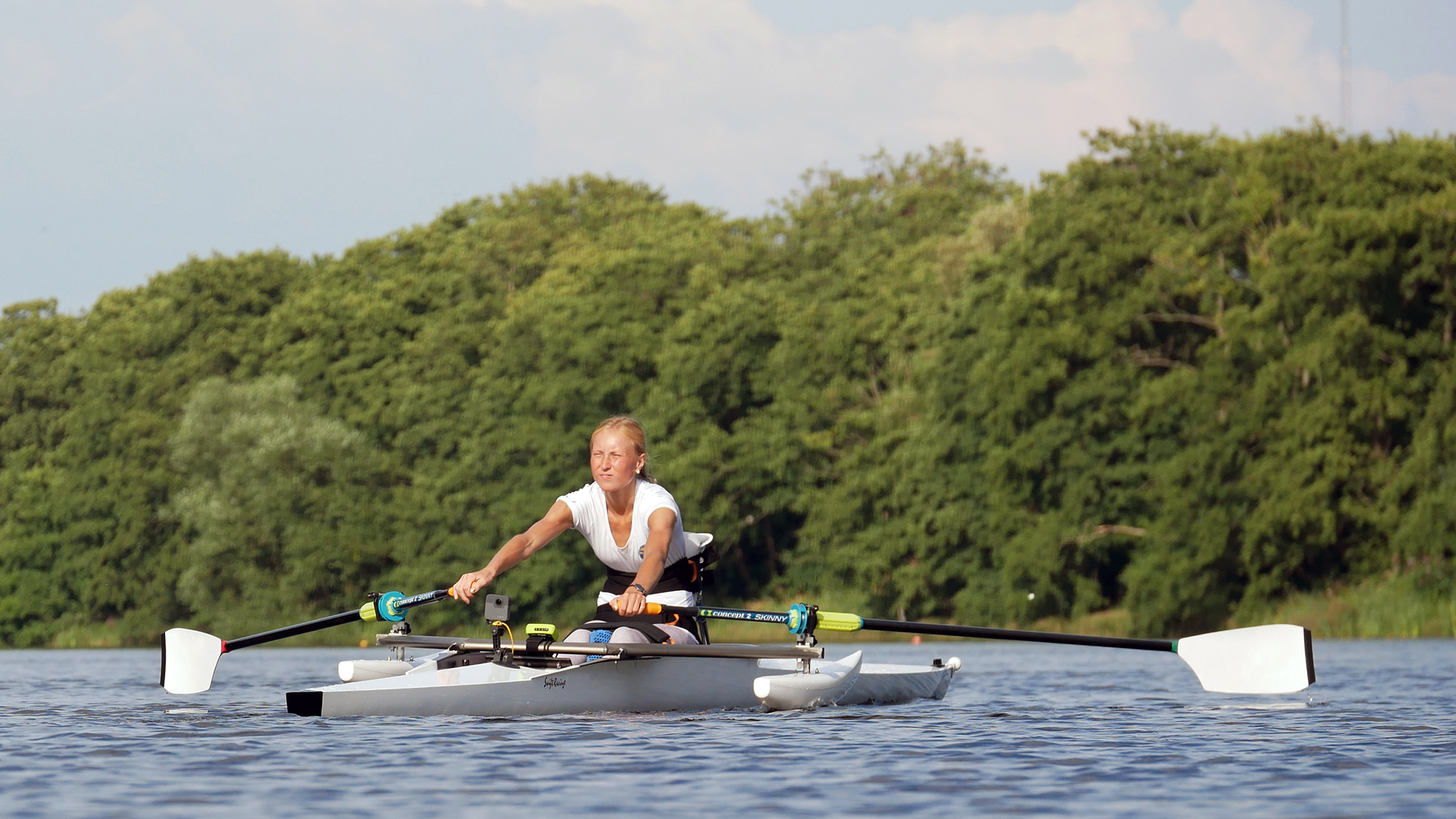 Ebba Einarsson practicing with some oars she had borrowed from champion Birgit Skarstein earlier this summer. In late August, Ebba went to Norway to practice with Birgit on Lake Årungen.
