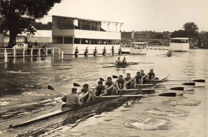 From London the Australians were taken to Henley-on-Thames. ‘Our accommodation in Henley was an old home, which had been turned into a boarding house. It’s now apartments, I believe. Each day, we walked to the Thames for training, where the traditional tents had been set up to house racing shells,’ Victor writes. ‘We didn’t take any racing shells with us, which was a big mistake. So, we had to borrow an eight. Although we had been assured that there wouldn’t be a problem, there was. Anything decent by way of a modern eight was being used by the English crews, so we had to settle for an old, well-worn boat.’ Victor continues, ‘We were all sorry we hadn’t brought our own boat with us, but it was all down to cost.’