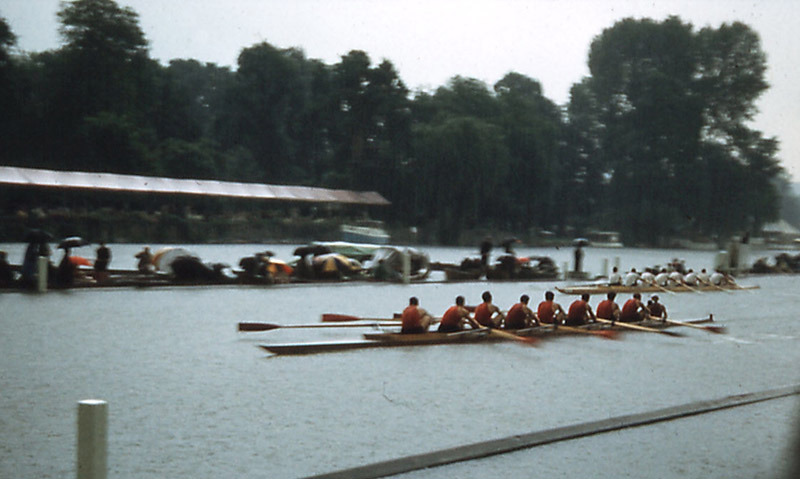 What Henley Royal Regatta 1939 – 1968 is not mentioning is the weather for the race, something that Cleaver is not missing in his article in Rowing: ‘During the big race in the Grand Challenge Cup on Thursday between U.S.A. and U.S.S.R. there was one of the fiercest thunderstorms ever remembered at Henley, the cheers of the crowd being deadened by the crash of thunder, and the scene being limelit by incessant lightning…’