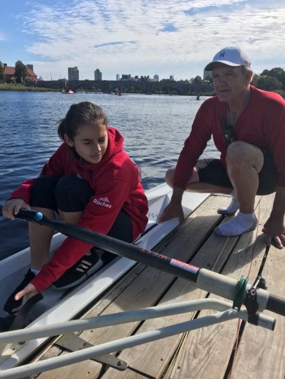Sofia Priebe, known from this website as the amazing teenager who races in a single scull despite being blind, was specially invited by the Q’s Chief Referee Linda Muri, who is the women’s coach at MIT. She also works at Rocket Science Rowing. ‘It was thanks to Kathy Parker [Harry Parker’s widow], who drew Linda’s attention to Sofia,’ Sofia’s coach Bob Berry said.