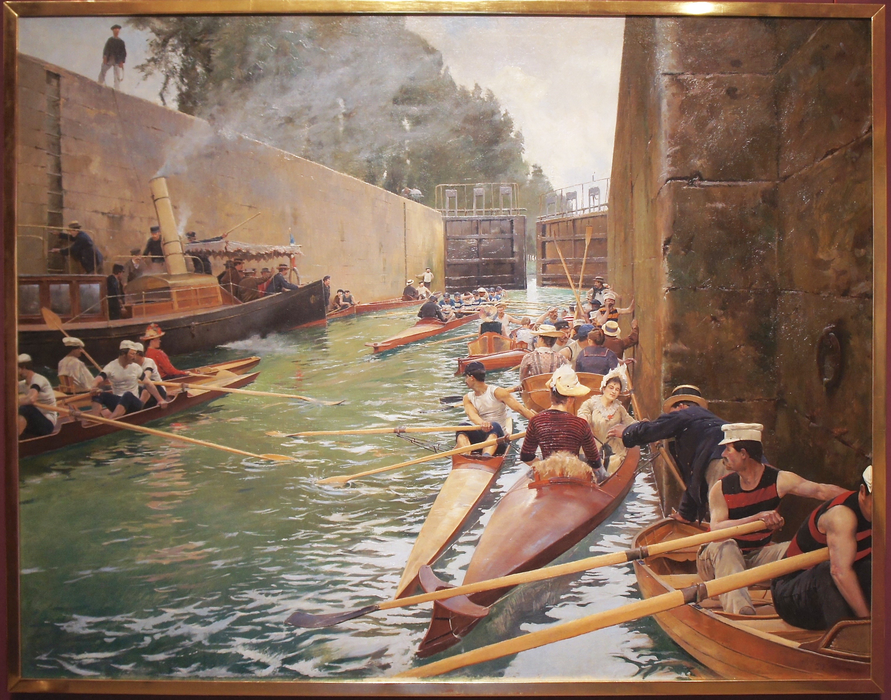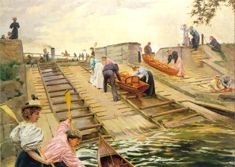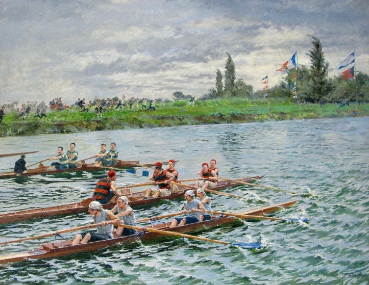 He also represents the Seine: the annual match between the Société Nautique de la Marne (his club) and the Paris Rowing-Club shows the race between Boulogne and Suresnes (1882). He also painted in England, such as Molesey Lock teeming with boats (1896).