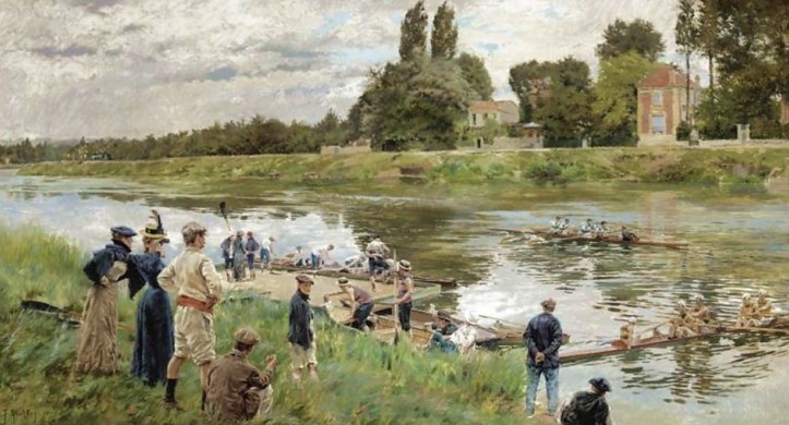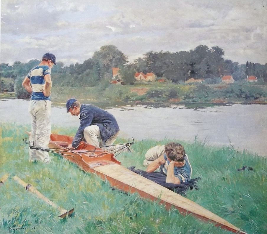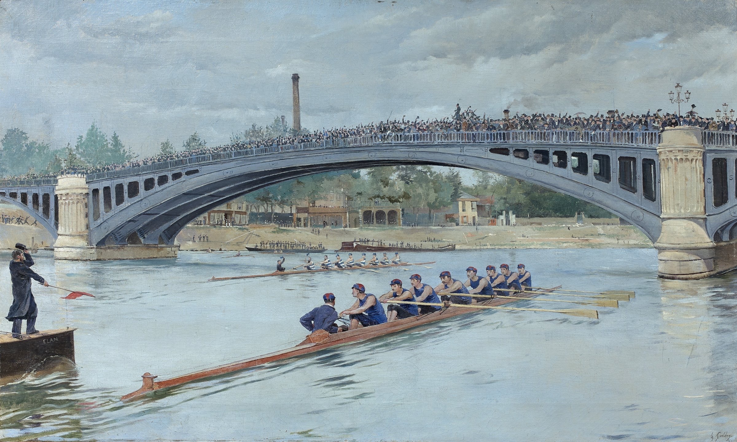 The boating paintings of Gueldry show the banks of Marne River are between 1880 and 1907 between his 22nd and 49th years when he was a high-level competitor and international referee. His ‘Launch of an outrigged eight’ (1907) is probably his last painting showing the Marne.