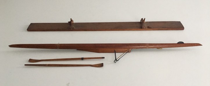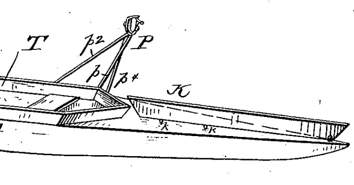 When the patent question arose, I thought that it might have been for a fin, or skeg as some call it. I’ve never come across a US patent for the under water device. In 1883, Michael Davis (Portland, Maine) patented the ‘wind balance’. This was a vane attached to the bow deck (canvas) as shown in Image 2. It was suppose to counter the wind pressure on the stern of a shell by capturing wind on the bow section. However, there are images of its use in 1881 – Image 1. It was first used by prominent racers but eventually discarded.