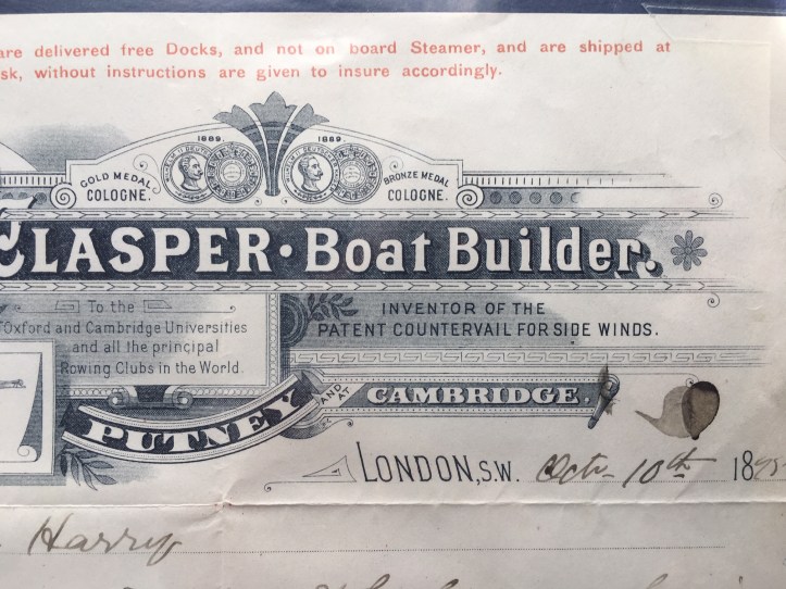 So when did the below water fin/skeg come into existence and who developed it? For lack of other evidence, it appears it was an invention of John Hawks Clasper. His Boat Builder stationary shows his claim of “Inventor Of The Patent Countervail For Side Winds” – see JHC Boat Builder stationery image below. The correspondence date is difficult to read, but it may say 1895.