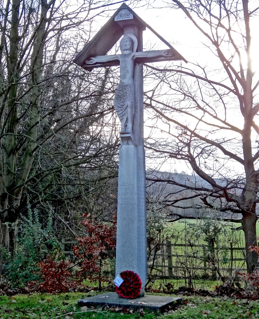 (The Bisham War Memorial is) by the renowned sculptor, Eric Gill, in the form of a Calvary depicting a crucified but triumphant Christ executed in Portland stone… (It is a) good example of Eric Gill’s newly resolute, Romanesque style figure of Christ that had emerged from his reaction to mass bereavement caused by the war… (It is) a powerful Christ, not a dying or suffering figure. This resurrected Christ, that has conquered death, was intended as spiritual comfort to the bereaved… Gill also made a brass plaque in c.1917 to the memory of Kelly, which is inside Eton College antechapel.