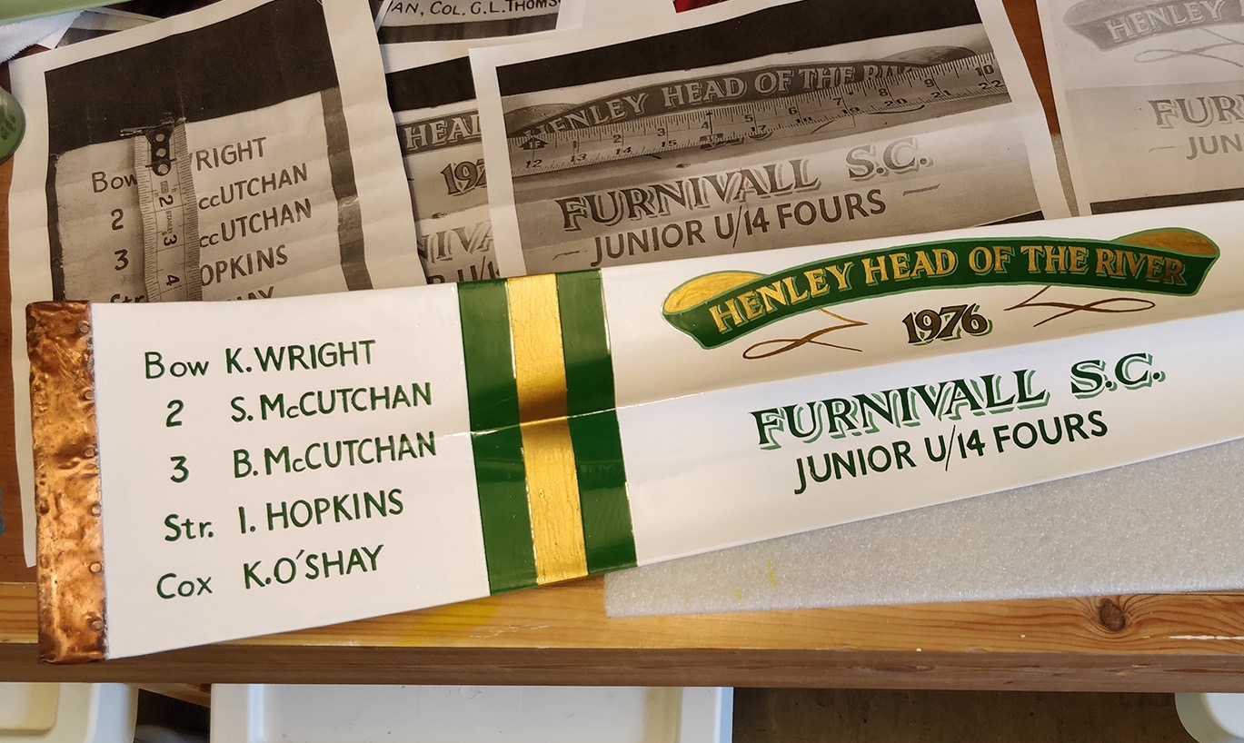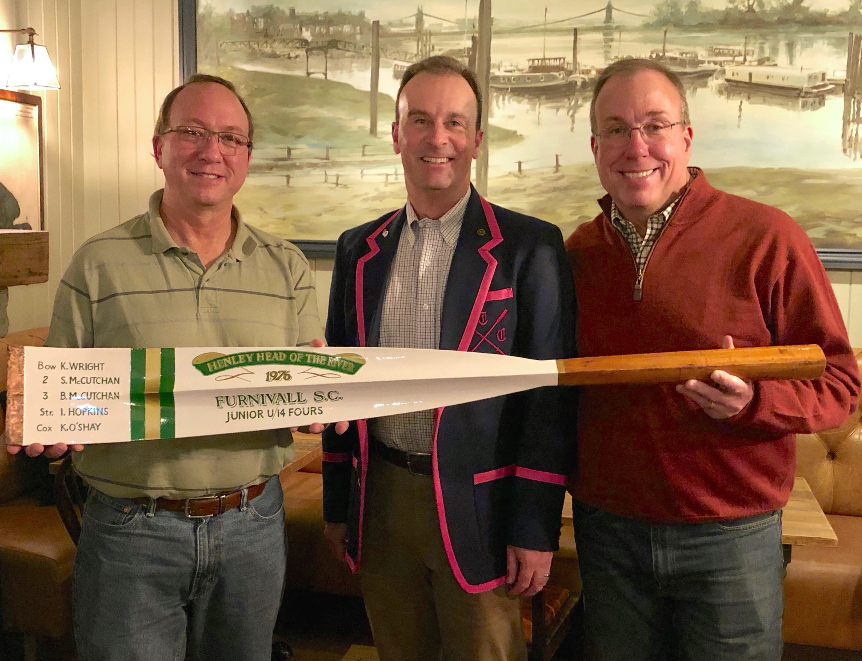 Poor Brian was completely stunned! So much so that he didn’t really question Stuart’s decision to be in London to surprise him, nor did he notice the large box under my arm. Soon inside the pub, and still armed with the element of surprise, Stuart said that he had something to present and out of the box came the new oar. Needless to say, a wonderful dinner was had with many stories about the old days. After dinner I left the family still bubbling with excitement.
