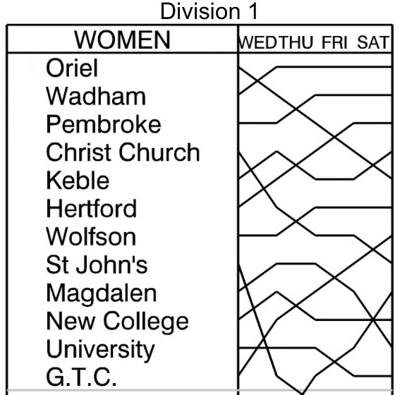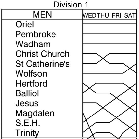 Torpids, Women’s Division 1. Wadham displaces Oriel to go ‘Head’. An upward line means that the crew made a bump, downward indicates that they were bumped themselves, horizontal means that they ‘rowed over’, i.e. did not make a bump and were not bumped.The Trinity women are happy, they rose three places over the four days. Picture: @trinitycollegejcr.jpgTorpids, Men’s Division 1. Oriel ‘rowed over’ every day to stay Head.Most college porters’ lodges display a low-tech results board during bumps. This is for St Edmund Hall and shows that the men’s first boat (M1) bumped every day and its crew is thus eligible for illuminated ‘blades’ recording their success. The college’s only women’s crew did less well and dropped eleven places. Picture: @stedmundhall.An illuminated blade from the Torpids of 1930.Lents, Women’s Division 1. Newnham goes Head, replacing Jesus.Downing W2 got blades. The foliage in their hair indicates that they have made a bump. Picture: @Trudie_DavidsonLents, Men’s Division 1. Caius replaces Lady Margaret at the top.Feeling the strain. Picture: @Trudie_Davidson