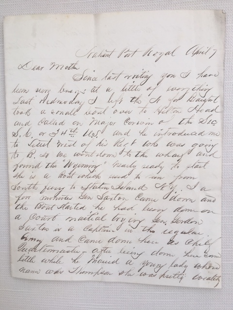 Since last writing you I have been very busy at a little of everything. Last Wednesday I left the N[ahant] for Beaufort – took a small boat over to Hilton Head and called on Major Corwin of the Sec. S.C. or 34th U. S. and he introduced me to Lieut. West of his Regt who was going to B[eaufort] so we went down to the wharf and found the “Wyoming” nearly ready to start. She is a boat which used to run from South Ferry to Staten Island N.Y. I[n] a few moments Gen Saxton came down and the boat started. He had been down on a court martial trying Gen Gordon. Saxton is a captain in the Regular Army and came down here as Chief Quartermaster. After being down here some little while he married a young lady whose name was Thompson. She was pretty wealthy and that gave him a start and now he is Brig. Gen. and Military Gov. of S.C.