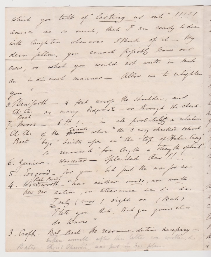 Wordsworth presents his crew to Merivale. About Staniforth, he writes: ‘8. Staniforth (Ch. Ch. Boat): 4 feet across the shoulders and as many through the chest.’ About number 2, J. E. Arbuthnot, Wordsworth writes that he is ‘strong as Bliss’s best’ (which was a Harrow beer). Wordsworth continues to write: