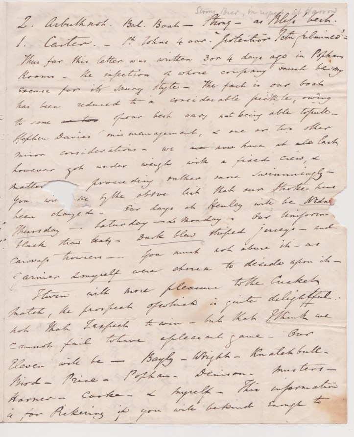 Thus far this letter was written three or four days ago in Popham’ rooms, the infection of whose company must be my excuse for its saucy style. The fact is, our boat has been reduced to a considerable pickle, owning to some of our best oars not being able to pull, [boat builder] Stephen Davies’s mismanagement, and one or two other minor considerations. We have at last, however, got under way with a fixed crew, and matters are proceeding swimmingly. […]