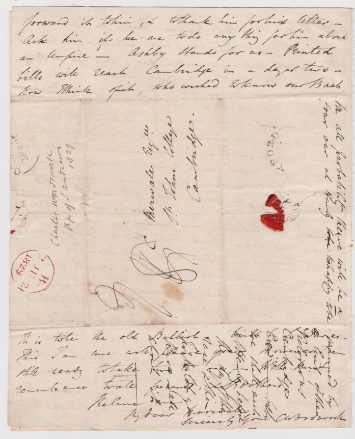 Charles Wordsworth’s 2 June 1829 letter to Charles Merivale should be of interest to several people and institutions. If you are one of them, start saving…