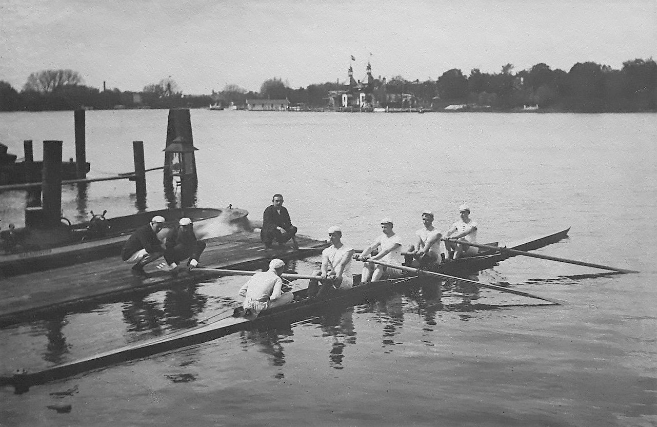 The Akademischer Ruderverein Berlin (ARV Berlin) was founded on 29 June 1891 as a student rowing club and was originally located in Stralau, a borough east of the historic city centre of Berlin. In 1903, the club moved to the Berlin suburb of Grünau, where the regatta of the 1936 Olympic Games was held. The following article seeks to illustrate both the club’s early years and to provide an overview of the watersports scene in Grünau with the help of selected pictures from the album and a couple of contemporary postcards. Whilst briefly alluding to some boathouses in the close vicinity, I assume the numerous boathouses and regatta buildings along the Grünau regatta course would be well worth a dedicated article.