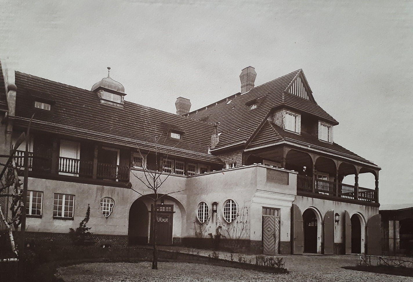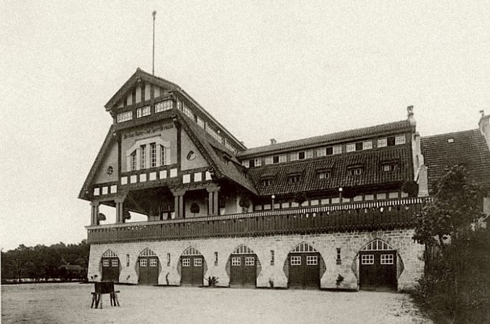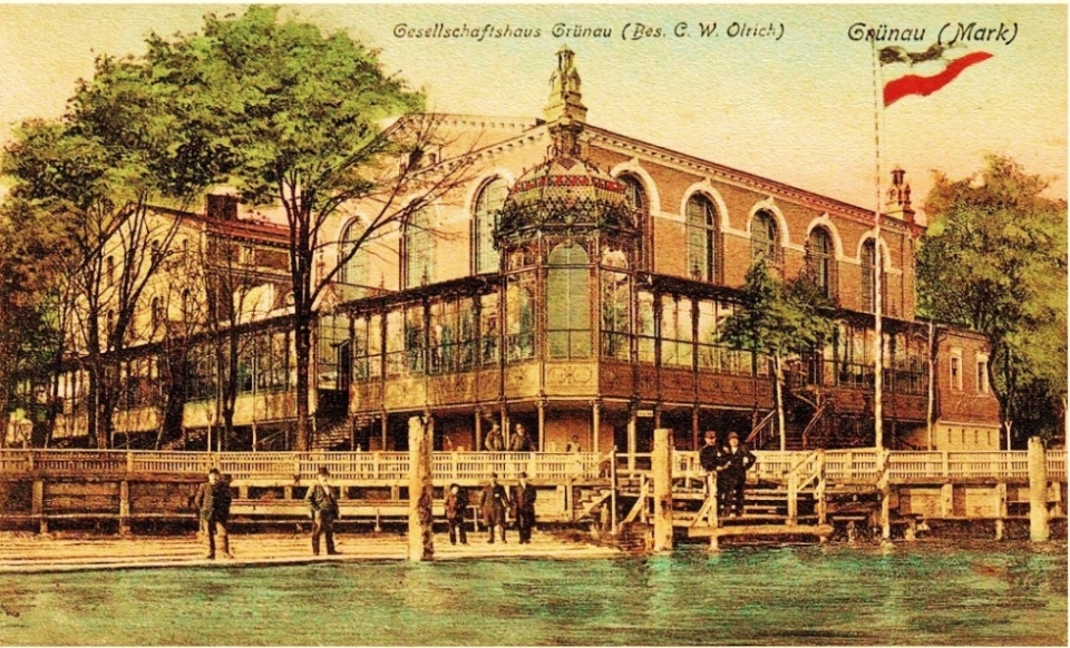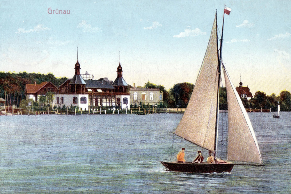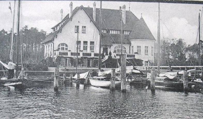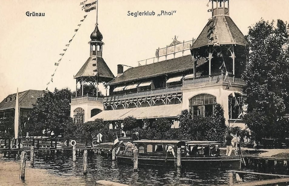 The Sailing Club Ahoi was situated on the banks of the river Dahme in Grünau, just on the finishing line of the regatta course, and can also be seen on the famous picture of the finish of the eights race at the 1936 Olympics. The splendid house survived the war, but lost its two little towers over time and is home to the Yacht club ‘Wendenschloß’ today.