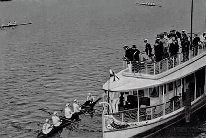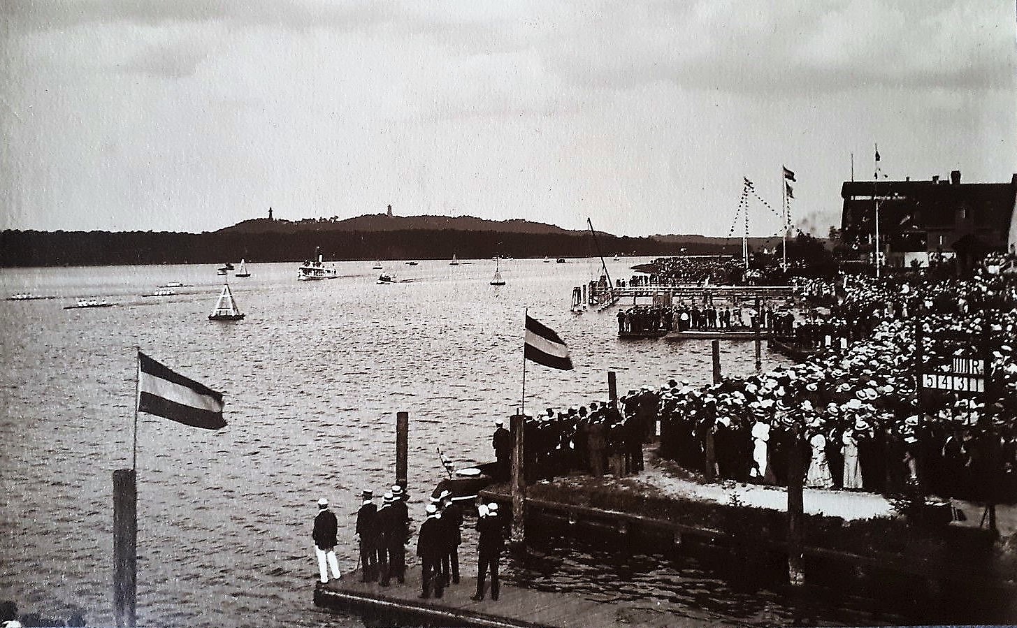 The race was followed by the Kaiser in this royal yacht Alexandria and the victorious crew would moor at the yacht and receive the trophy from the Kaiser’s hands. This picture was shot near the finish line of the race course and the boathouses of ARV and Sport Borussia are visible in the background.