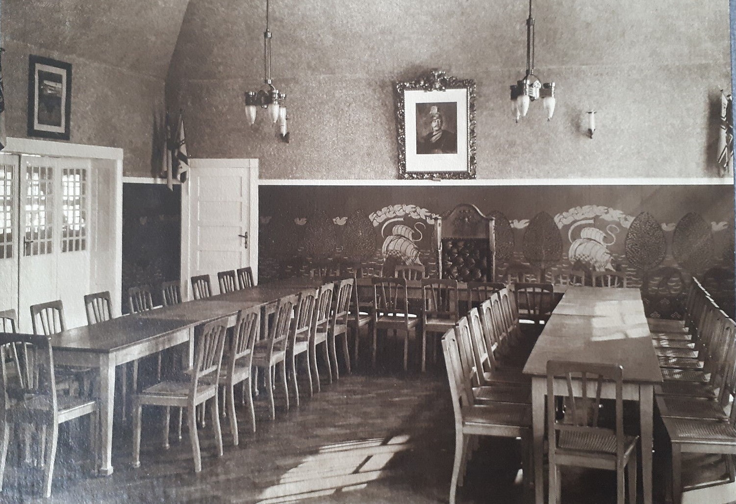 As the above shows, the interior of the ARV Berlin boathouse was mainly styled in the rather plain version of German Art Nouveau, particularly reflected by the lamps and wallpapers showing the typical cogs used by the Hanseatic Union. The Kaiser manifested his great affection for water sports in general and for the young ARV in particular by dedicating a signed portrait of himself, an honour that was only bestowed on ARV Berlin and his own fraternity, Corps Borussia Bonn.