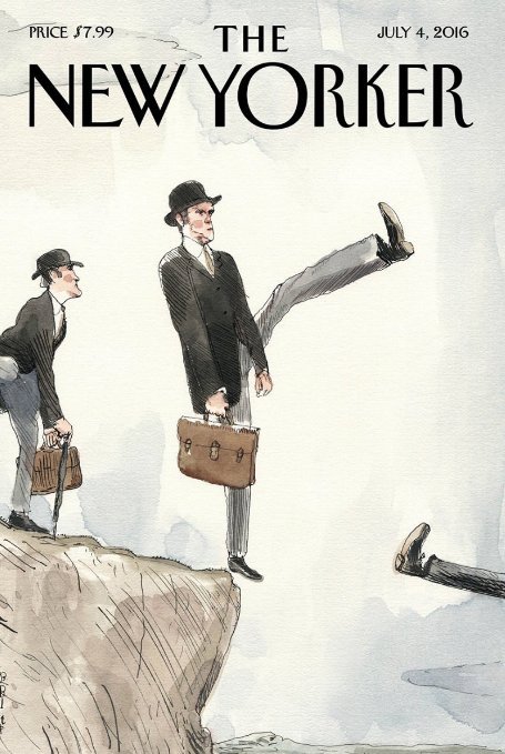 This “New Yorker” cover uses Monty Python’s John Cleese and his ‘silly walk’ character, a stereotypical Englishman, about to step into the abyss (though Cleese actually supports Brexit).One American’s view of Brexit by Nate Beeler, first published in “The Columbus Dispatch”.Kipper Williams in “The Spectator”.