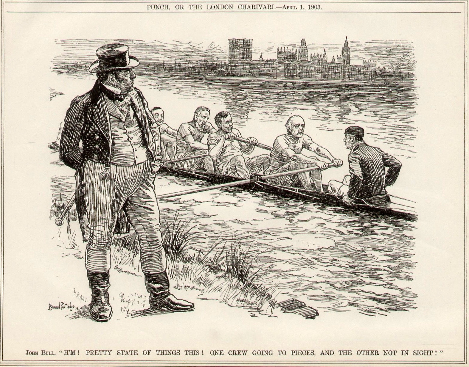 ‘Pulling together’, 1852. Queen Victoria urges unity in Lord Aberdeen’s new administration of 1852. Aberdeen formed his government from the coalition of Free Traders, Peelites and Whigs that had passed a vote of no confidence in the previous government.‘Not pulling together’, 1903. John Bull, the personification of Great Britain, observes that the Conservative Government is hopelessly split over free trade and that the main opposition party is bereft of ideas. Thankfully, those days are over.‘Some pulling together, some not’, 1955. The Conservatives hope to take advantage of disunity in the Labour Party. In fact the Labour ‘stroke’, Clem Attlee (who took a keen interest in rowing matters), fought the 1955 General Election as Labour Leader, only resigning seven months later at the age of 72, having led the party for 20 years.