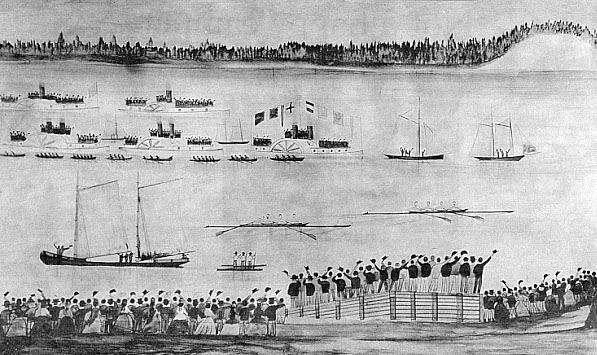This memorable race took place on the Tyne on 19 April 1859 between local hero Robert (Bob) Chambers and Thomas White from London. After fouling a keel boat after half-a-mile, Chambers fell about 100 yards behind White and it looked like the locals had lost their bets and began to grumble. But by turning the race on its head, Honest Bob Chambers proved himself as the greatest oarsman of the age.