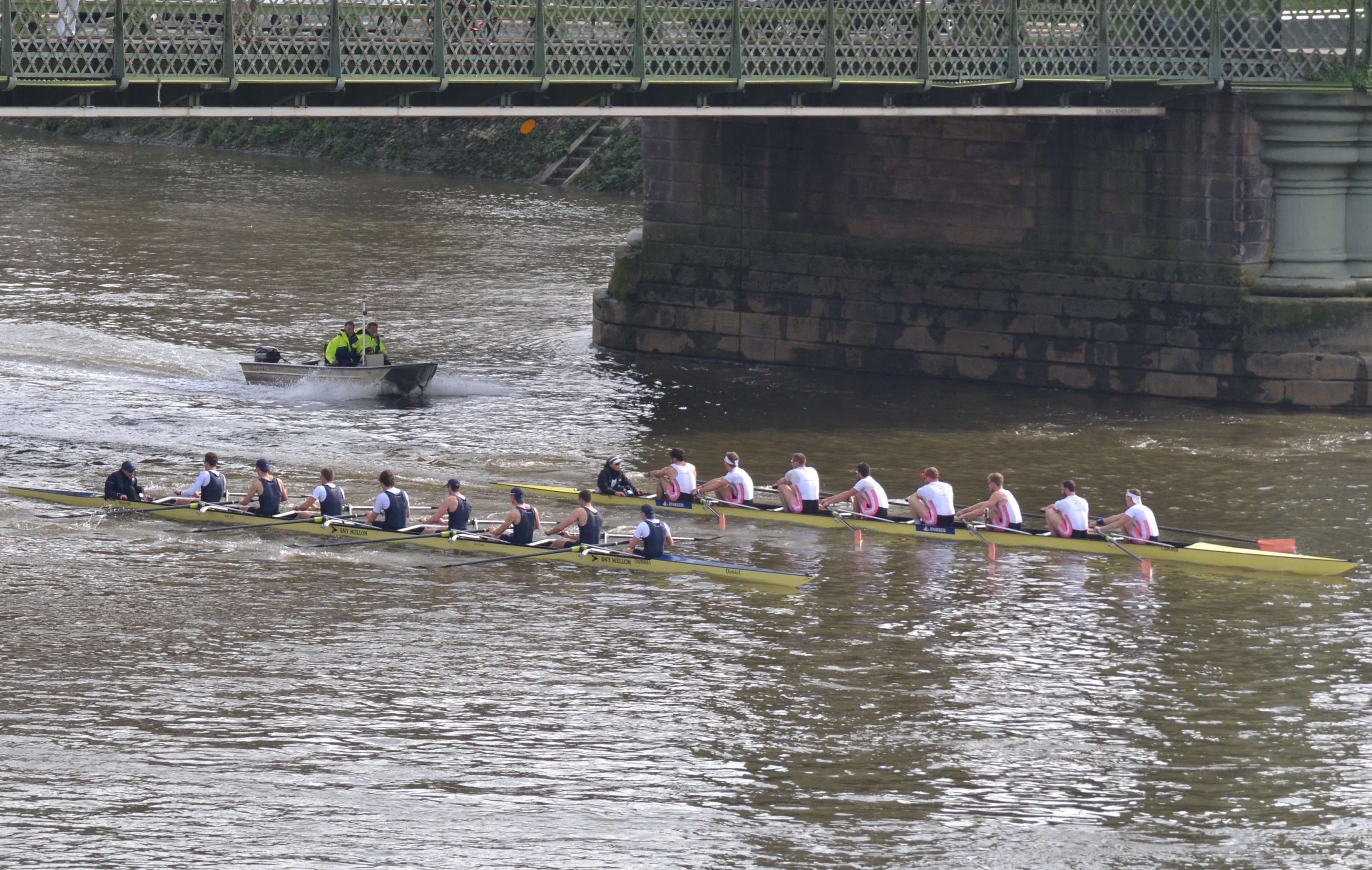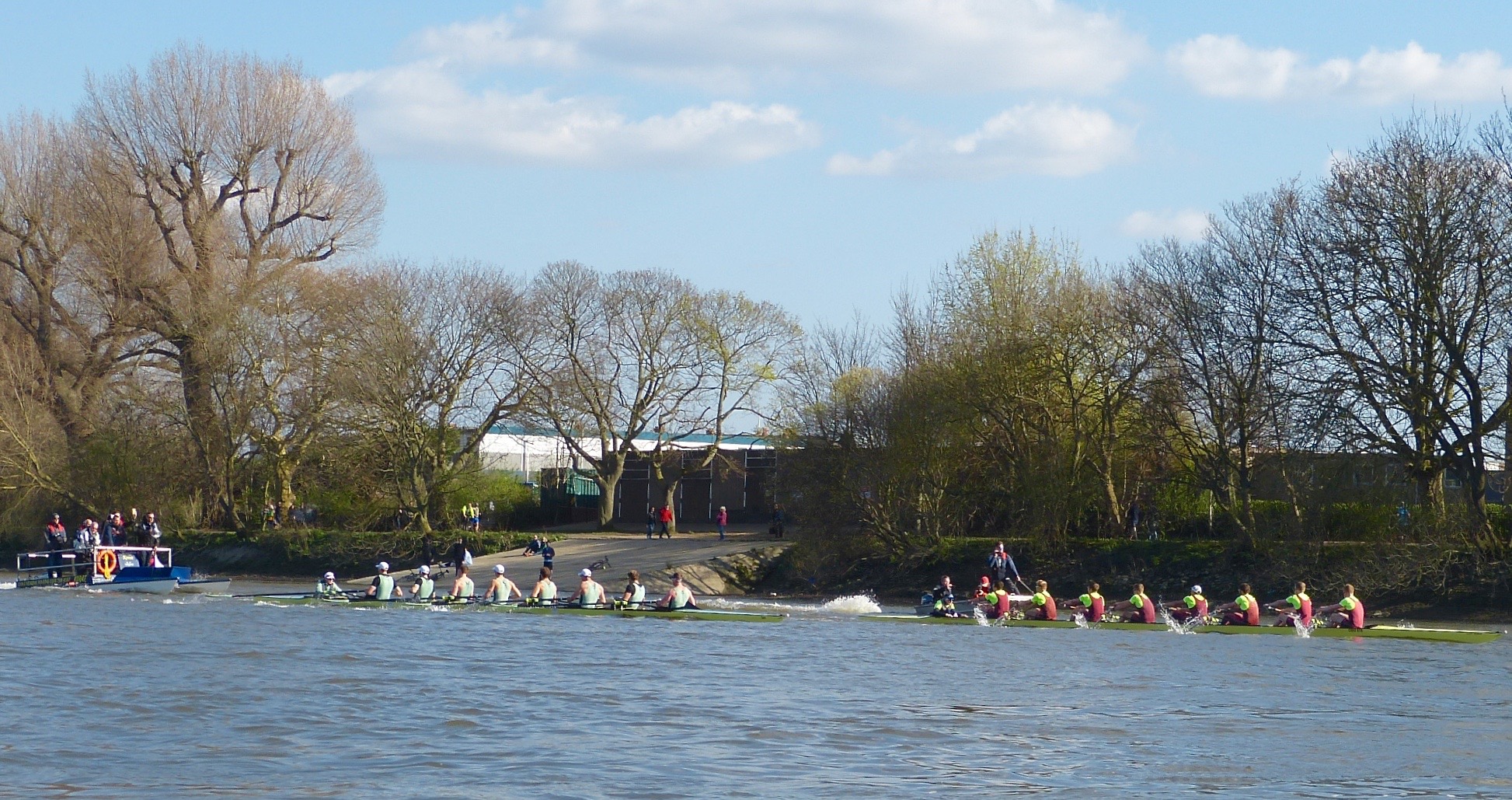 The first race was from the start of the Boat Race Course to Chiswick Eyot. Molesey lead out to a quarter of a length lead. Approaching Fulham Football ground, the crews were level. Oxford’s rhythm gave them a quarter of a length advantage and they continued to build on this lead, winning by one and a half lengths. In the second piece, from Chiswick Eyot to the finish post just before Chiswick Bridge, Molesey lead again. The crews were level underneath Barnes Bridge. In the remaining three minutes of the race, neither crew had a clear lead but in the final strokes, Oxford managed to get their bows in front and crossed the line a quarter of a length up.