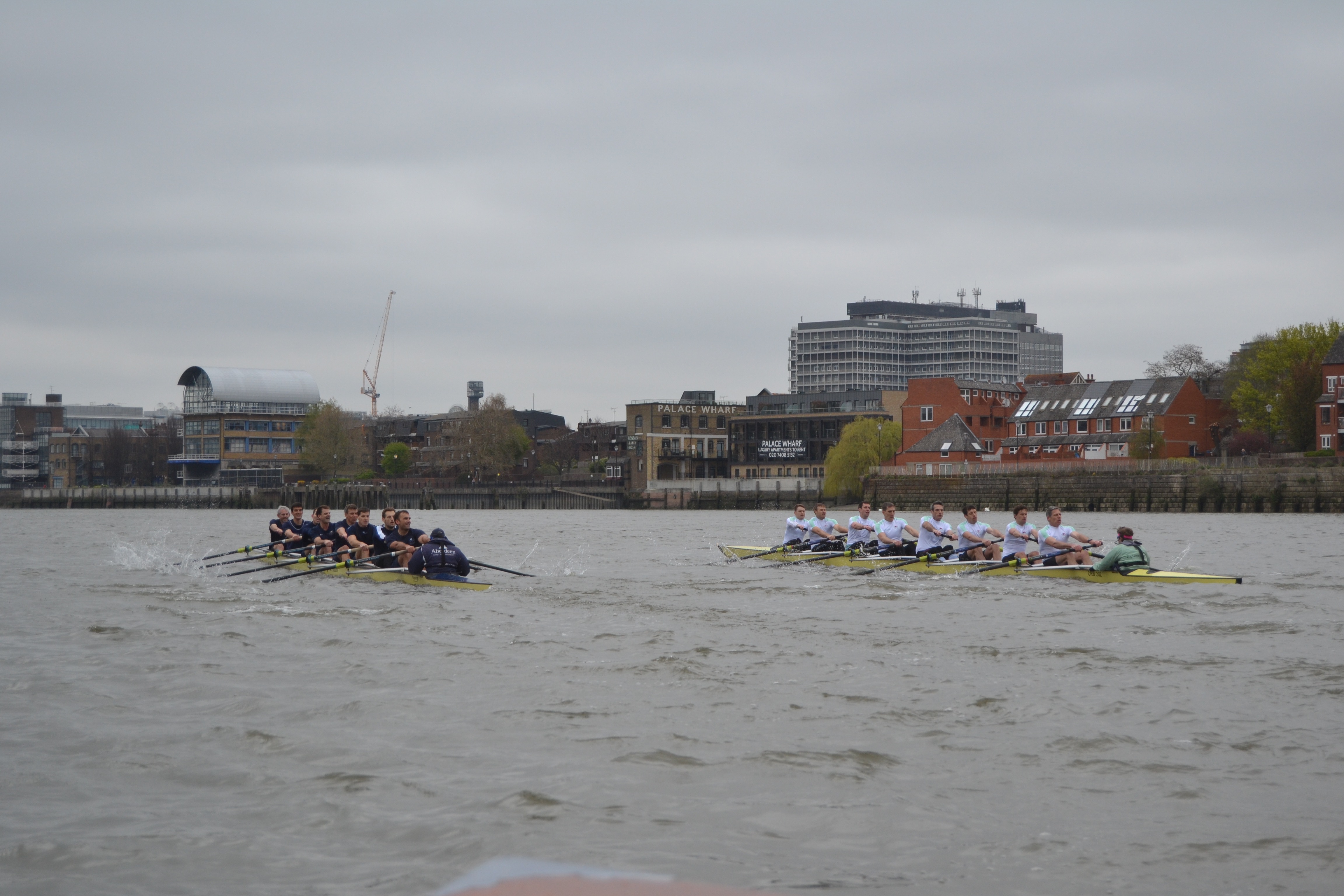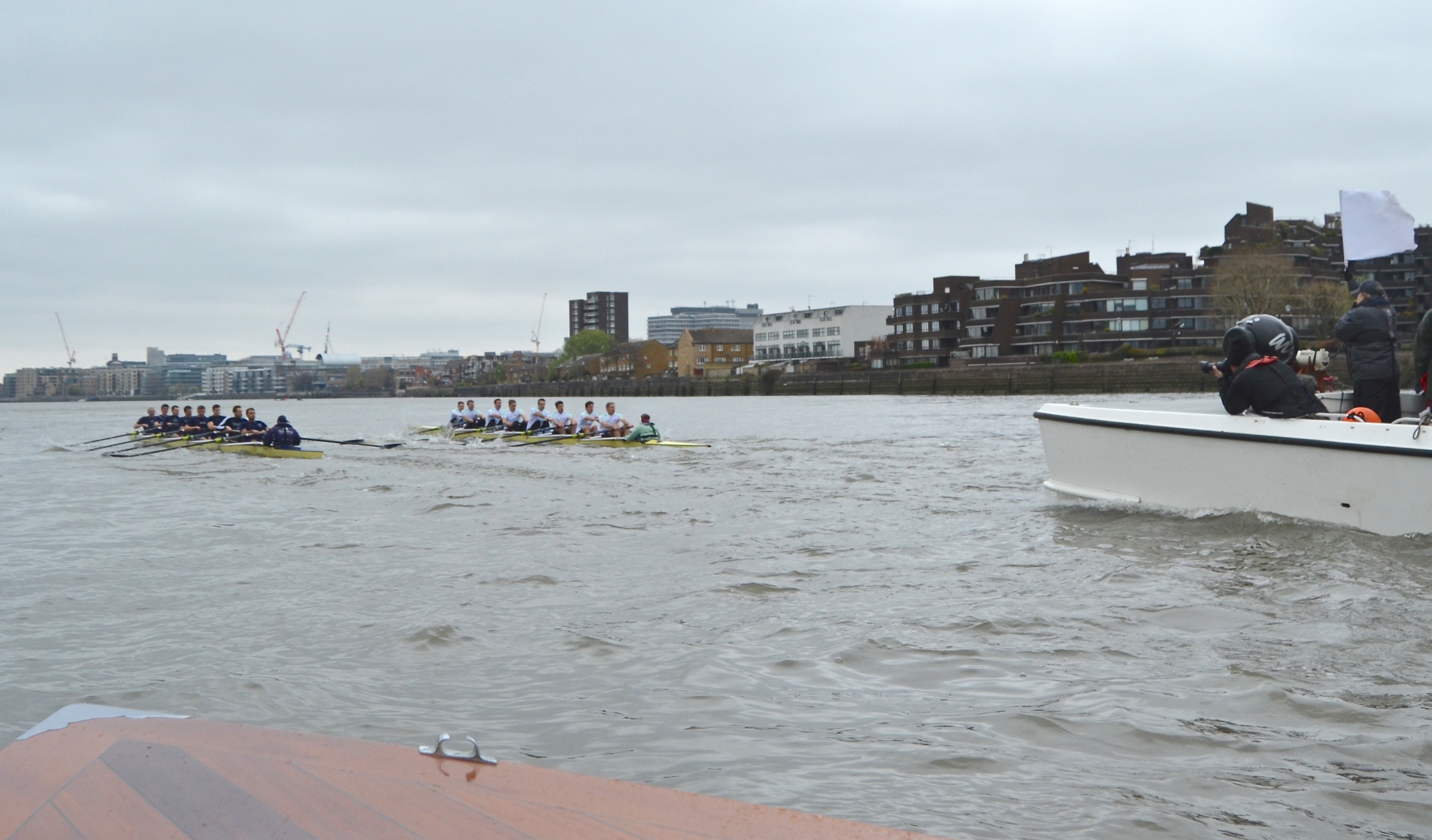 So here we were: reset and start again. From the Mile Post it was effectively a new sprint to the finish and Oxford, regaining their lost rhythm, rapidly took advantage once more. For half a minute the two crews rowed in sync at 34.5, but Oxford was inching their bows ahead with every stroke (and being regularly warned) until they had half a length at the first set of riverside flats, and seven seats by the time they reached the autumnally-coloured Harrods Depository.