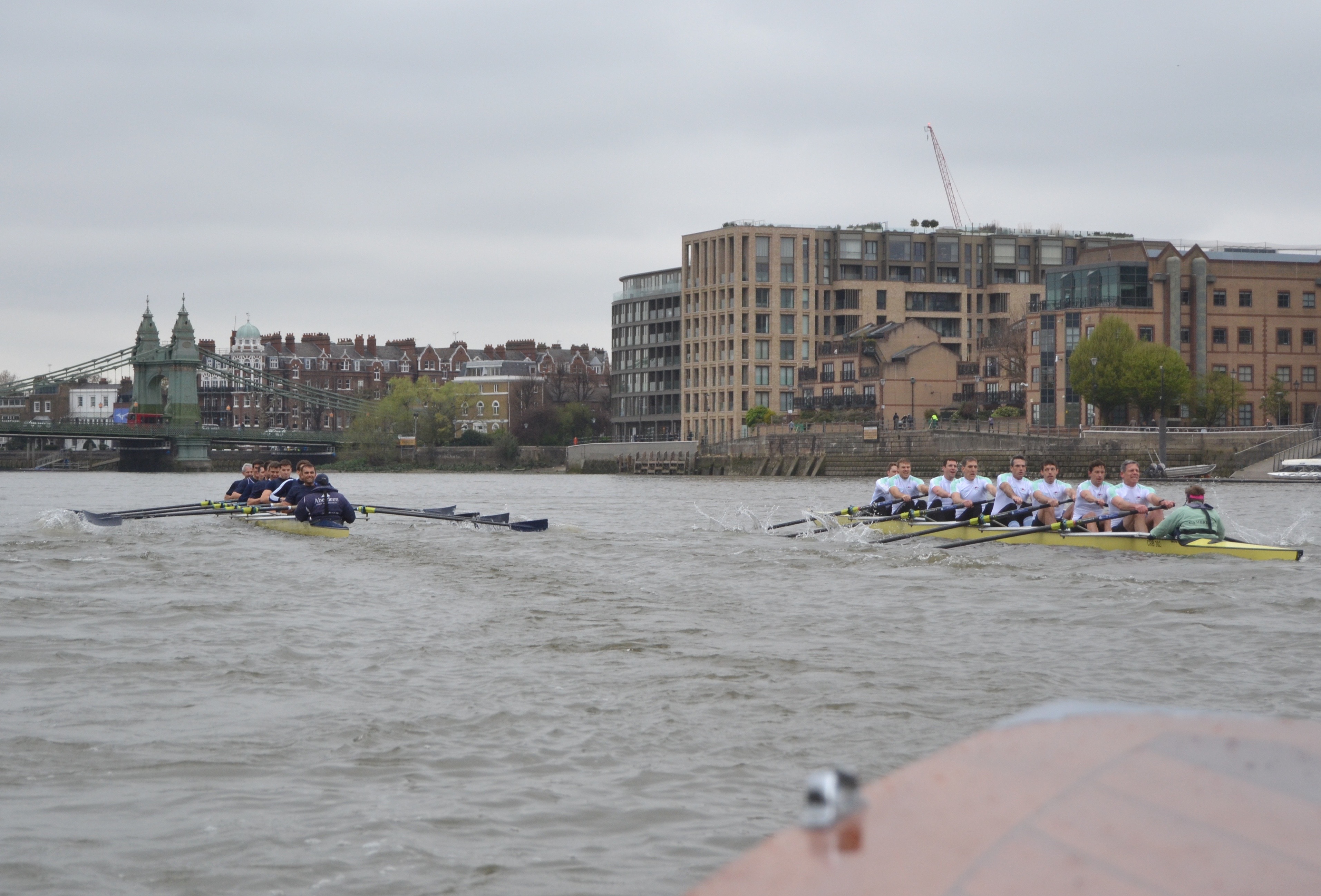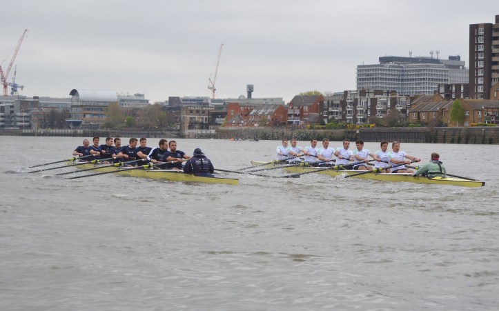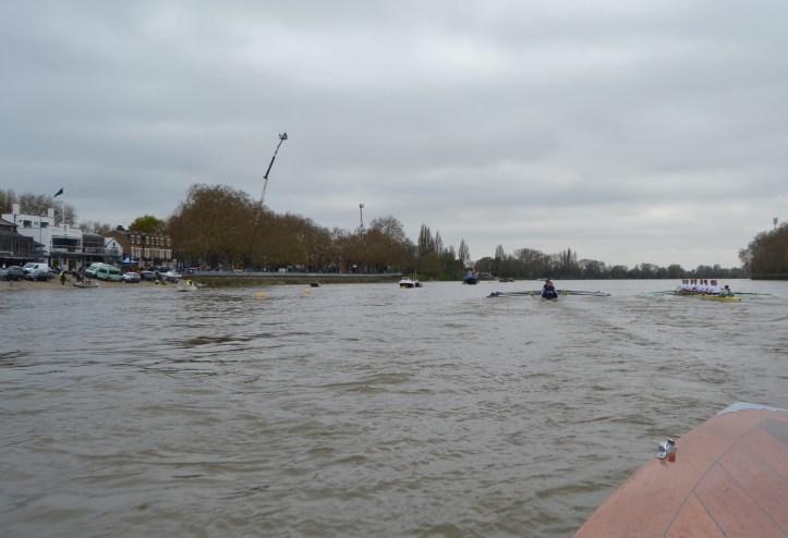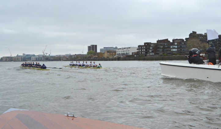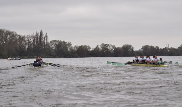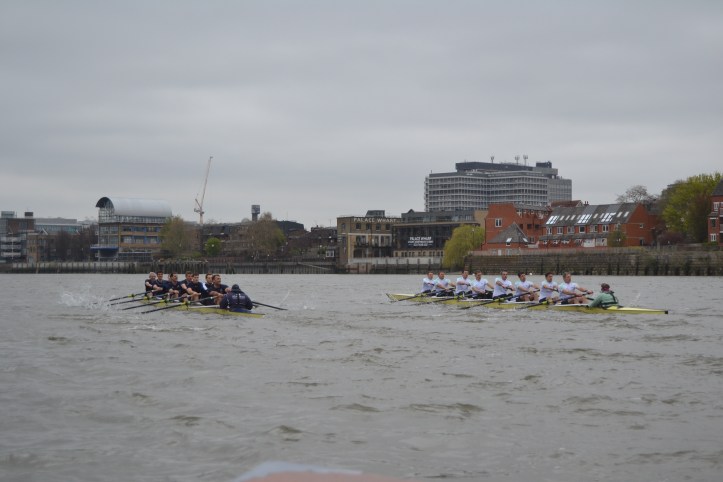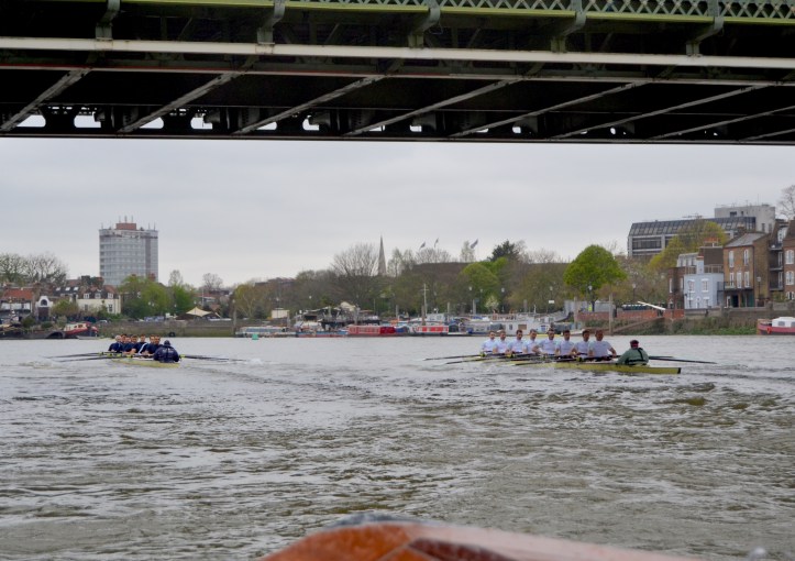Cambridge dug in to stop the rot with Hammersmith Bridge rapidly approaching, stroke Matt Parish leading push after push, but despite Oxford being the focus of the umpire’s attention again, the Dark Blues held the upper hand and did not need to lift their cadence to the finish, much to the disappointment of crew coordinator Jonny Searle, who was gesturing for them to sprint harder from the following launch. The two crews swept past the dead tree opposite Furnivall safely on their own stations (which doesn’t always happen) and still in contact. The margin, being a few feet short of clear water, was adjudged 7/8 of a length to Oxford, but was a credit to two spirited and determined crews.