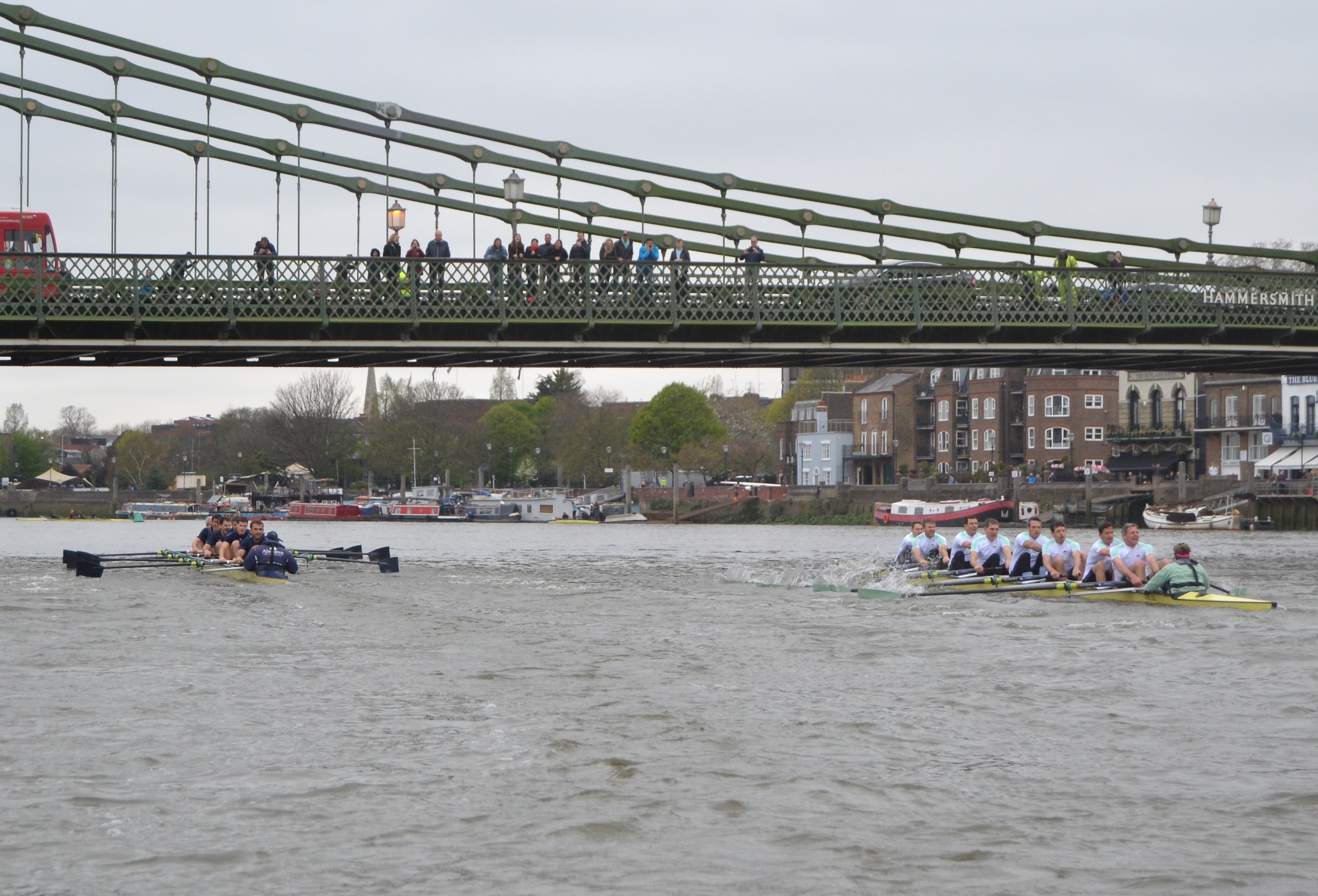 Both crews settled to rates in the mid-30s as they raced along the moored boats at Putney, cheered on by a respectably large crowd of supporters. Meanwhile umpire Judith Packer started to warn Cambridge, Light Blue cox Ed Bosson keen to take full advantage of the first Middlesex corner in his favour. Oxford at 35-36 continued to draw out steadily past their rivals: half a length ahead at Thames Rowing Club and two-thirds of a length at Beverley Brook with Cambridge dropping to 34.