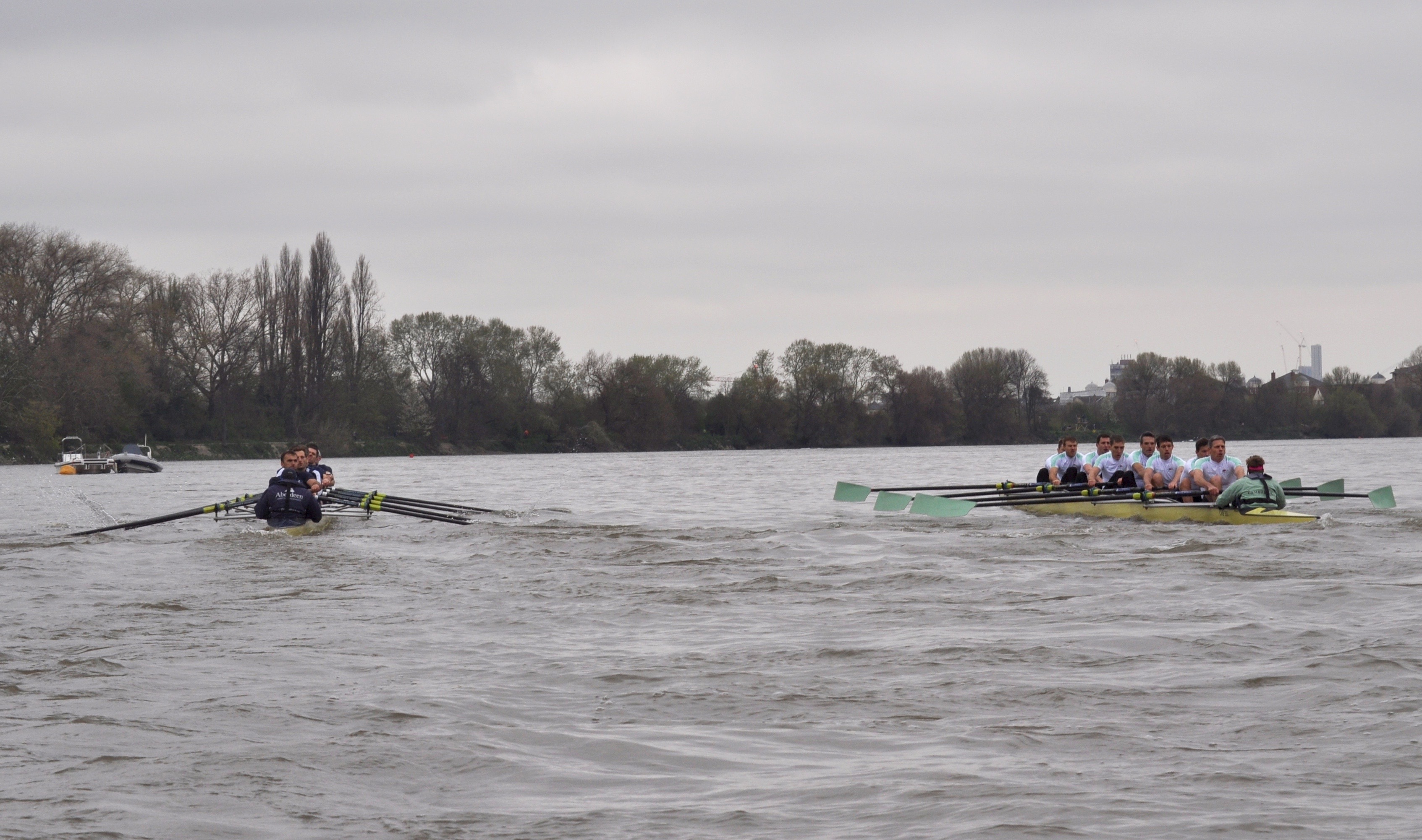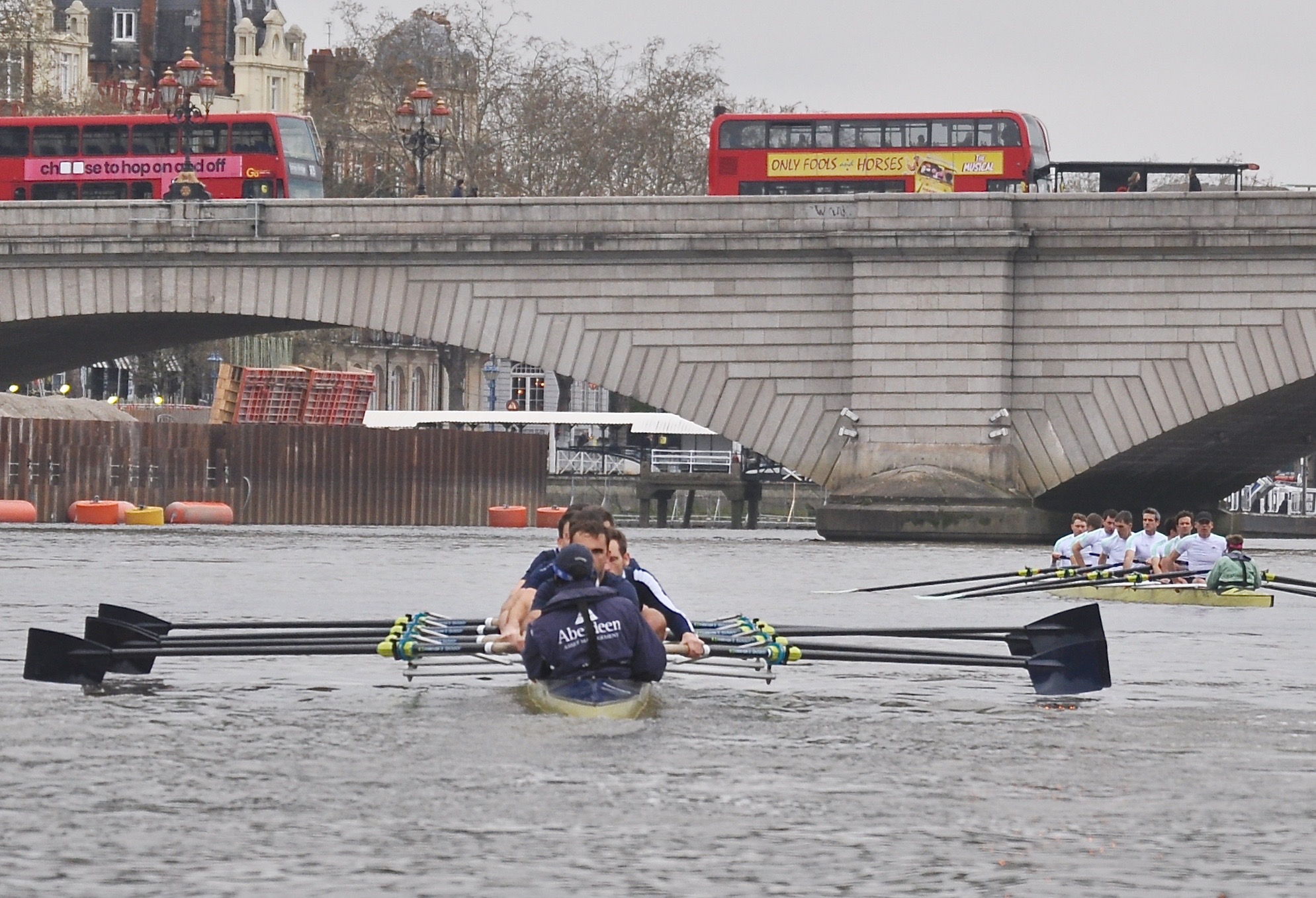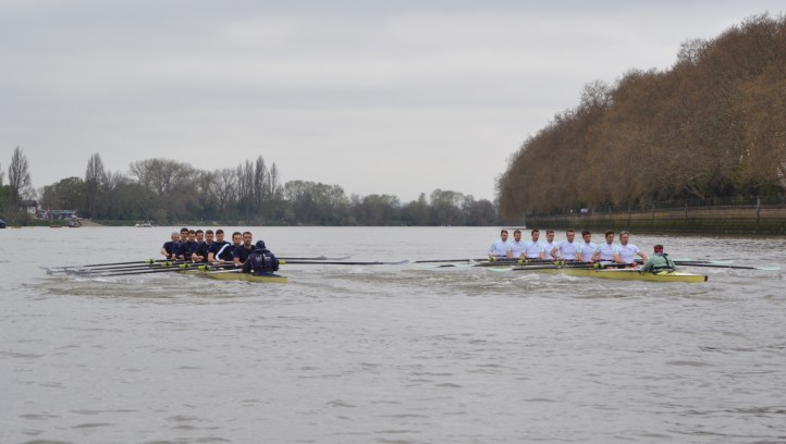 Under glowering grey skies and with the BBC helicopter hovering noisily overhead (the event is used as the BBC technical test) the crews slid through Putney Bridge and after a few taps managed a well-judged floating start, getting away cleanly first time with both crews rating above 45 for the first few strokes. Cambridge’s rate-lift was fractionally feistier, the Light Blues taking the first slight but visible lead as they built towards their stride, but Dark Blue stroke Ante Kusurin chose to keep the Oxford rate high for the next twenty strokes and it paid dividends, nailing Cambridge back and then pulling out first a canvas and then two seats’ lead.