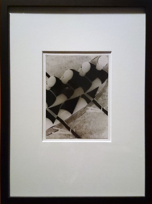 As to the silver gelatin print (23×17 cm) entitled “Training (Ruderer)/Training (Rowers)”, the work captures well the repetitive geometric pattern formed by the rowers in their boat. Repeated faceless figures reappear in the form of anonymous factory workers in other photograms. Depictions of leisure then gave way to labor. Alice Lex-Nerlinger abandoned repetition and featured an iconic symbol of physical labour and the working class.