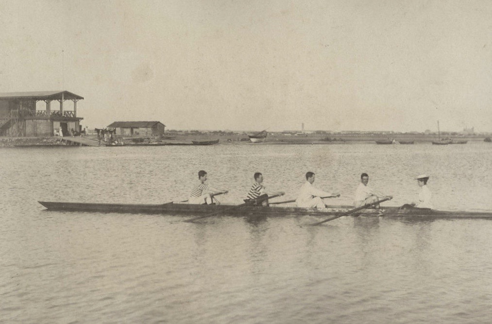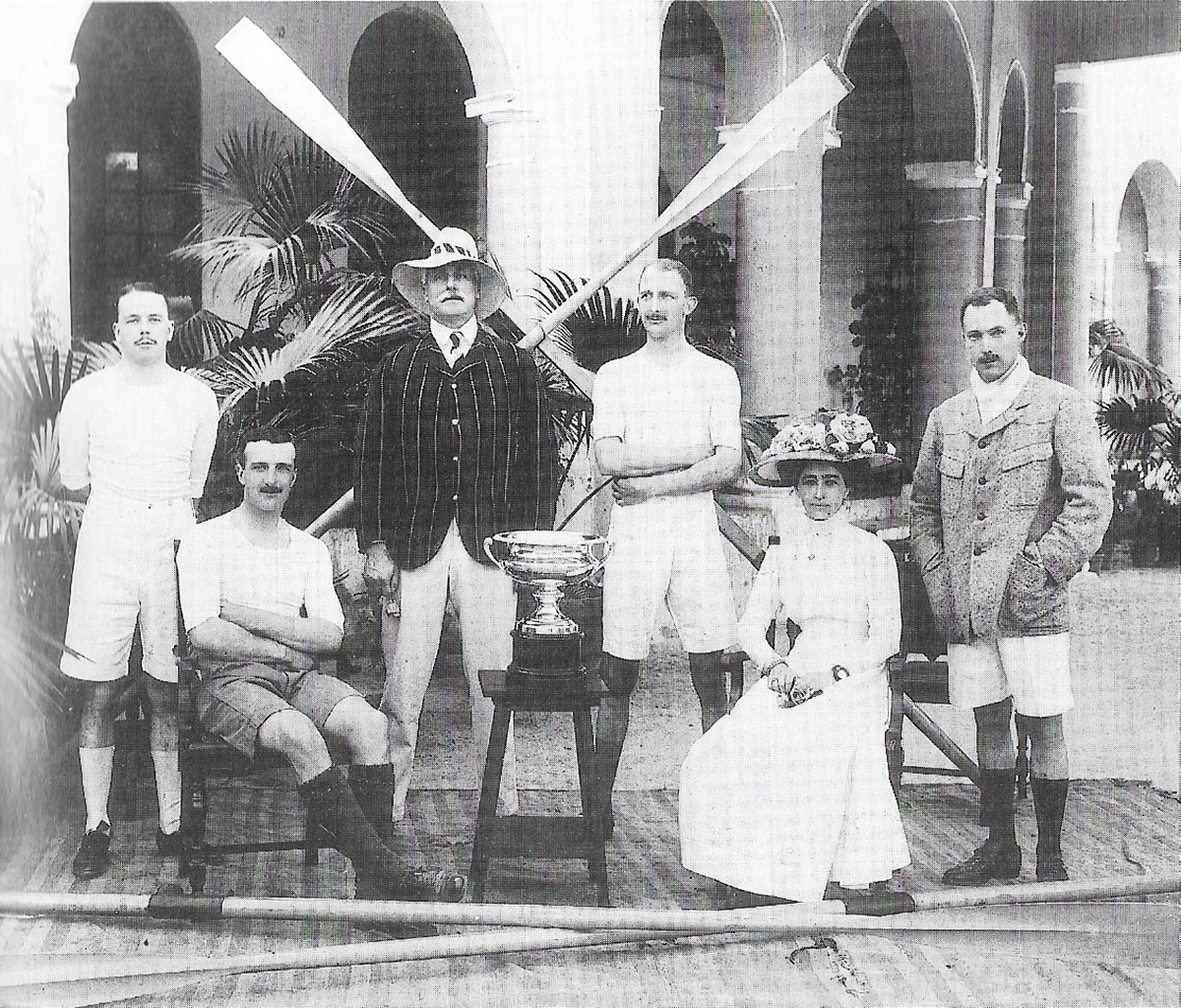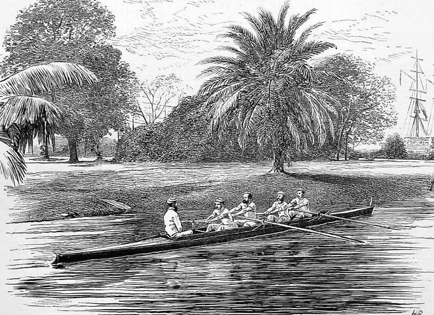 The Calcutta Rowing Club… was founded by a small number of enthusiastic oarsmen in 1858. This makes it one year older than the club founded in Shanghai and probably the oldest club in the east. Records show that the first boat the CRC owned was a six-oar…. An Eight was imported in 1866 and two more in 1870… Up to this time, all the boats had fixed seats, but, about 1872, one of the members of the Club brought back with him from England a sculling boat fitted with a sliding seat…