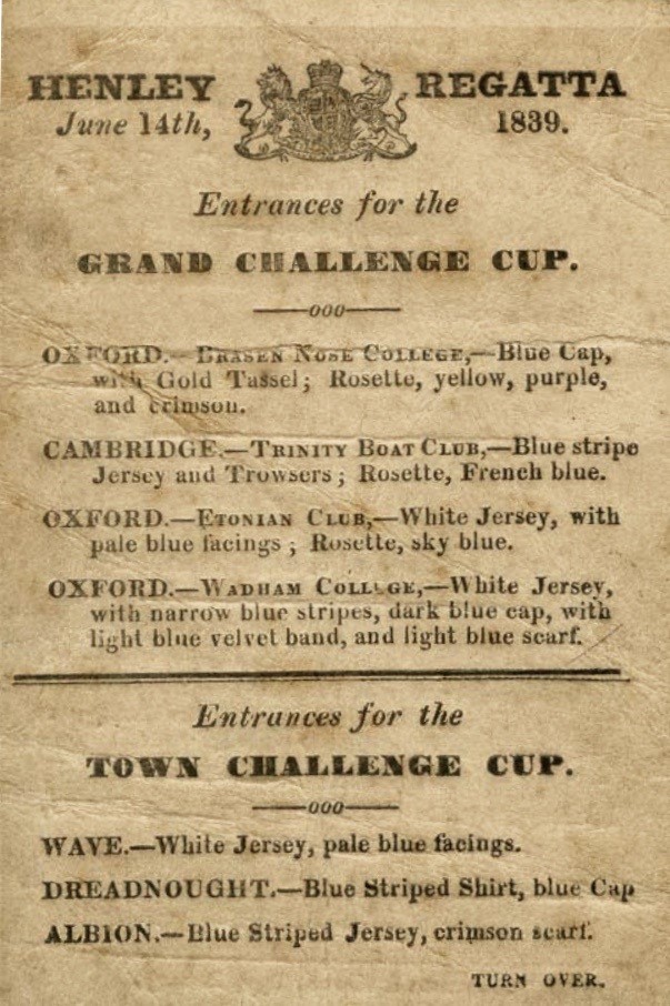 The first Henley Regatta was held over one afternoon and evening on 14 June 1839. It proved so successful that in 1840 it was run over two days. As the event became a British institution and part of the Summer Season, it was extended to three days in 1886, four in 1906 and five in 1986.