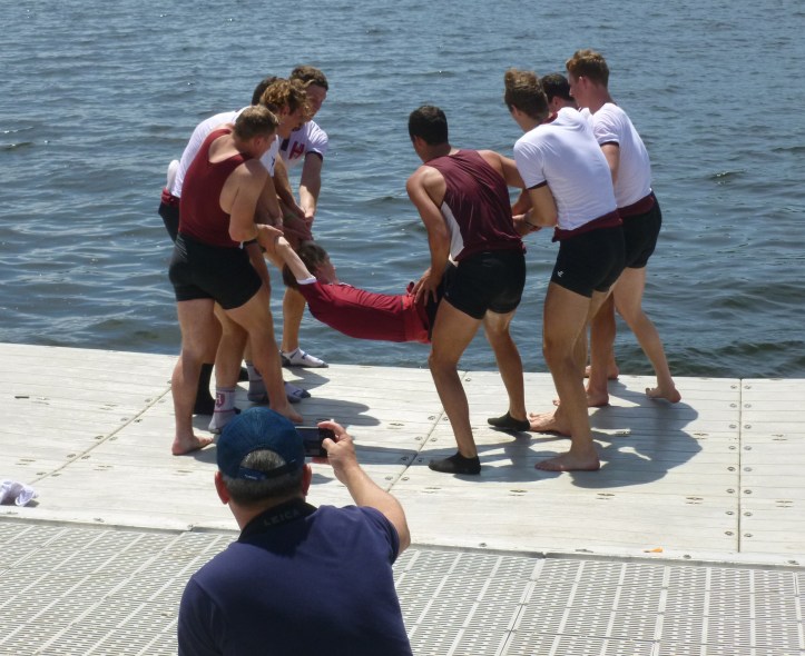 Harvard’s victorious 2nd Varsity boat was greeted by their teammates from the 3rd Varsity when they approached the dock. At one point, the boat’s Australian stroke, David Fleming, waved with The F. Valentine Chappell Trophy showing that Harvard had taken the second cup of the day.