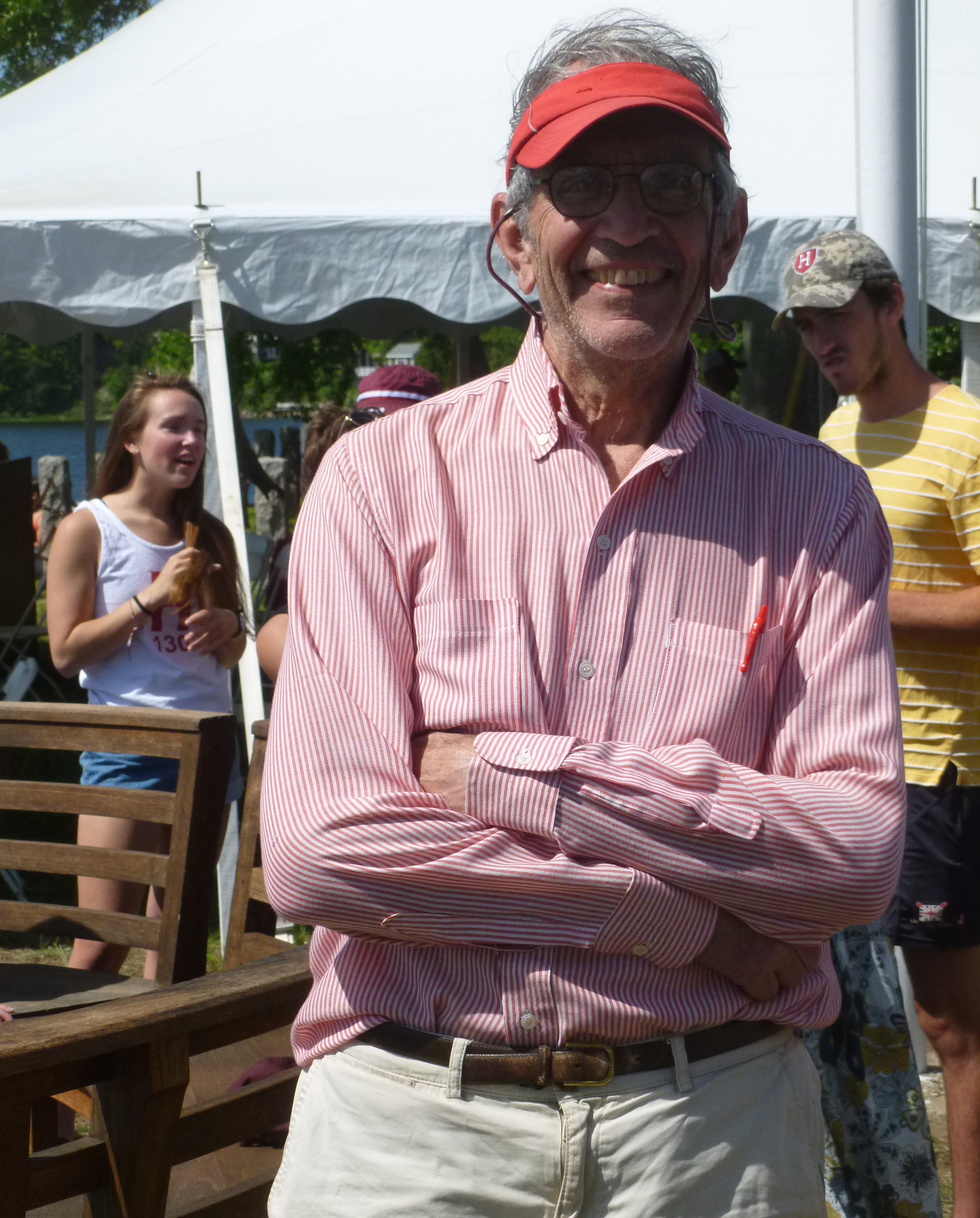 Many fans left the tent when we were able to see the two crews out on the river from Red Top. What seemed like a miracle, the Crimson sneaked up from behind, were suddenly neck-and-neck, then had a nose lead. The Bulldogs could not respond and fell behind. Rumour had it at Red Top that one of the Yale oarsmen collapsed but that is unconfirmed while I’m writing this. Big cheers from the Harvard fans when the Crimson crew crossed the finish line as the first boat. For the second consecutive year The New London Cup went to Harvard.
