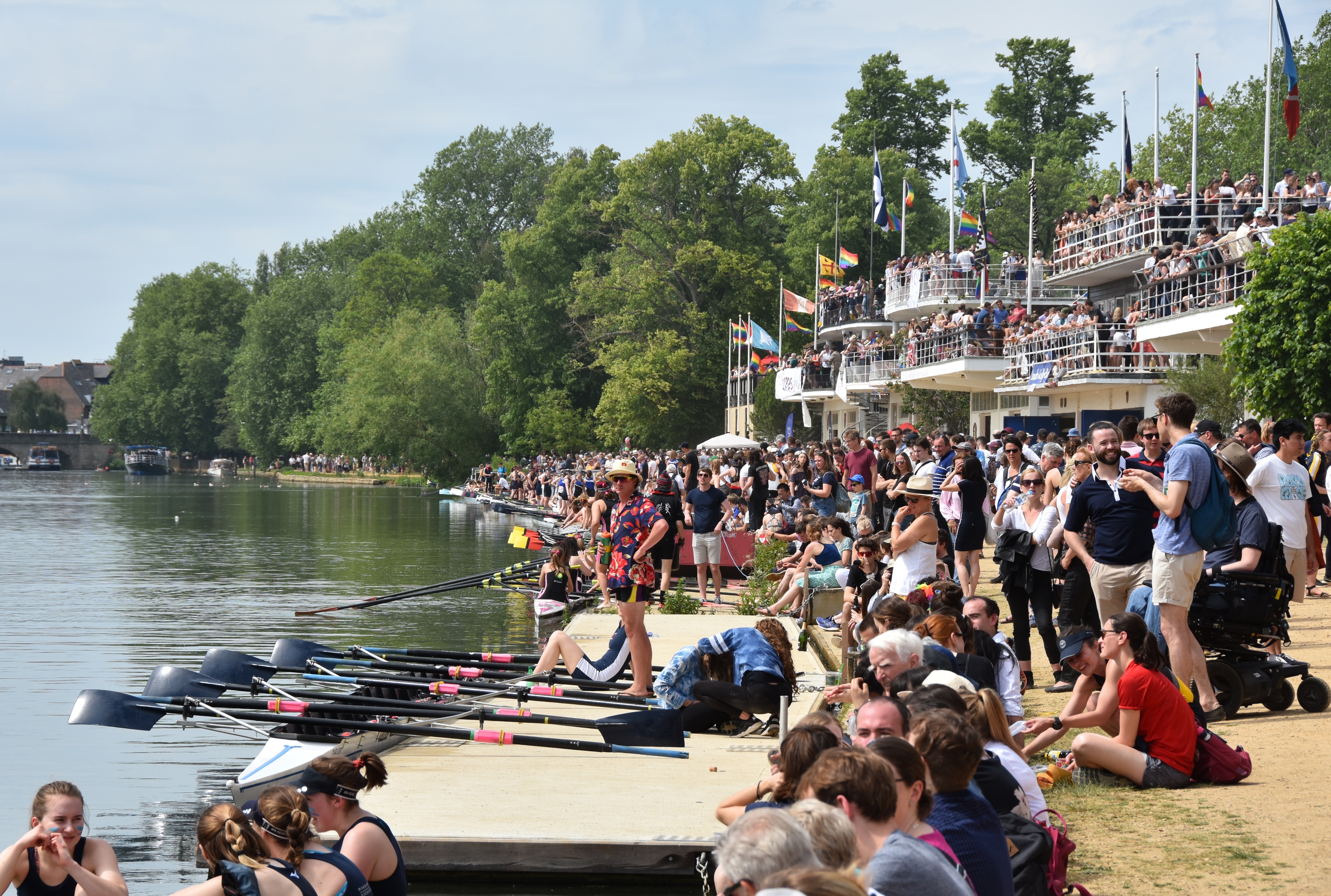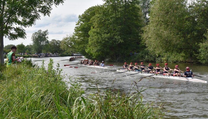 As the crowds increased in anticipation of the Division 1 races on the final day, it became more difficult to get boats through the throng and onto the river.The Mansfield First VIII.Green Templeton push off from the boathouses at Longbridges (hidden behind the trees on the left). They were built in 1996 and house Hertford, Mansfield, St Catherine’s, St Hilda’s and Green Templeton. Boathouse Island can be seen in the distance.Merton row to the start, passing the Somerville boat that had earlier failed to take the bend known as ‘The Gut’. After much effort, the new Filippi could only be extracted from the bank by cutting the bows off.