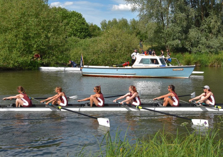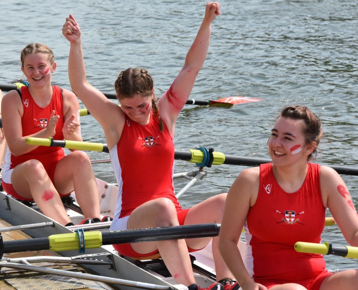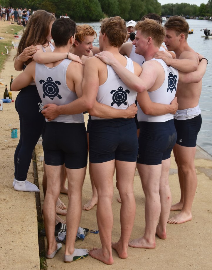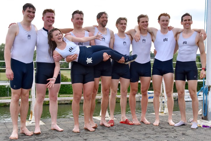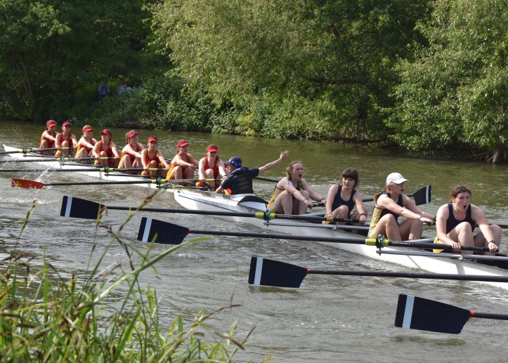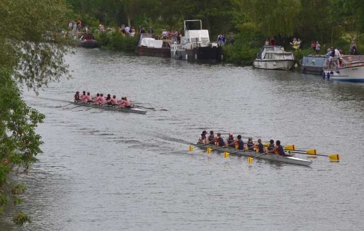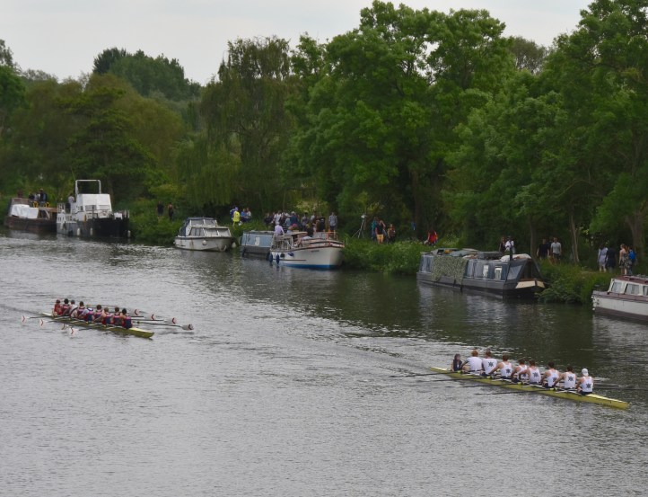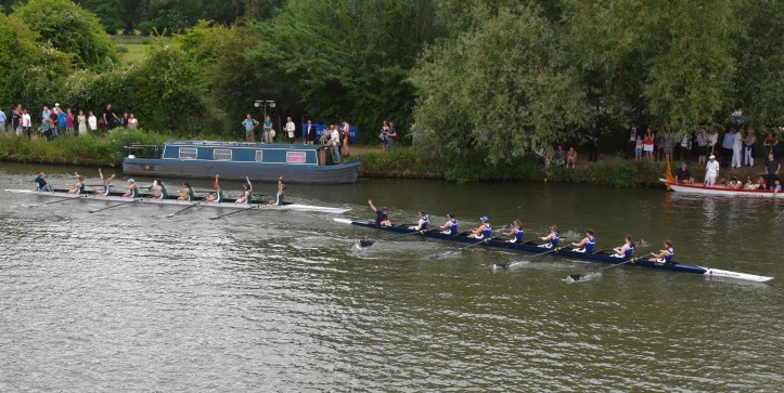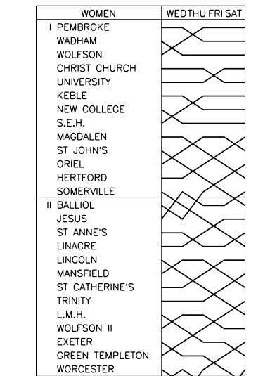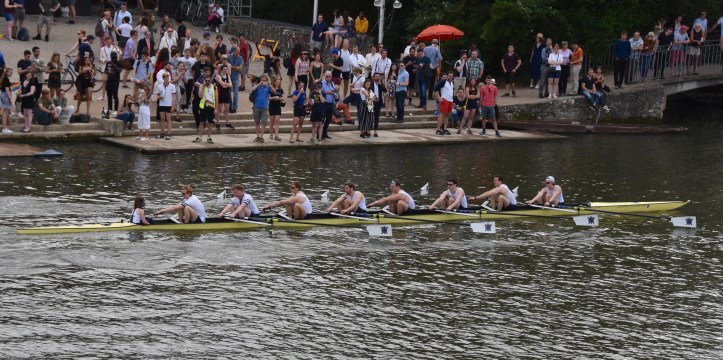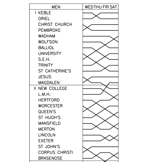 The leading crews in Women’s Division II. From right to left: St Anne’s, Somerville, Linacre, Jesus.Bumped in The Gut. Still in Women’s Division II, Trinity bumps Mansfield and the Mansfield cox raises his arm to acknowledge the bump and to concede.Near the finish, Jesus bumps St John’s in Women’s Division I.In the final race in Women’s Division I, Wolfson are first home, followed by Pembroke.Wolfson I, Women’s Head of the River 2019.The top two women’s divisions (of six) showing the results of the four days of racing in 2019. An upward line indicates that the crew bumped another, downward that the crew was bumped, horizontal that they ‘rowed over’ without bumping or been bumped. Wolfson started third but bumped Wadam on Wednesday, Pembroke on Thursday, and rowed over on Friday and Saturday, thus taking the Headship.The final race in Men’s Division I. Oriel is first home, followed by last year’s Head Crew, Keble. The division was earlier ‘klaxoned’ (abandoned) due to an incident producing safety concerns. In such circumstances, the finish order is that which existed at the time of abandonment.Oriel I, Men’s Head of the River, 2019.The top two men’s divisions (of seven) showing the results after four days of racing. Keble started Head, rowed over on Wednesday but were bumped by Oriel on Thursday (see here), the latter rowing over for the final two days and thus taking the Headship. The full men’s and women’s results are here.