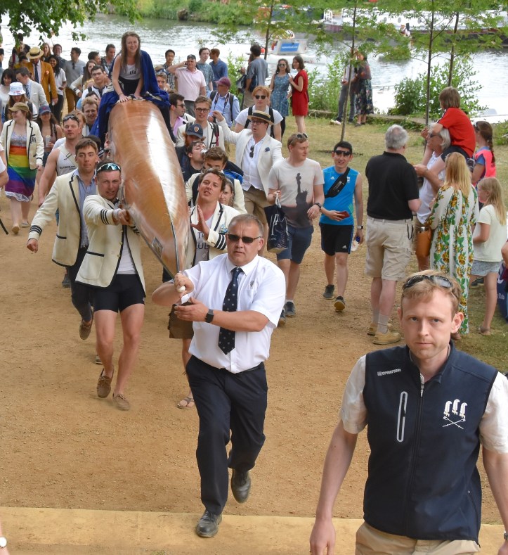 It’s time for Pimm’s.The Regent’s Park College Boat Club women bumped on all four days and so won ‘blades’, oars illuminated with a record of the boats that they bumped and with the names of their crew.By their smiles, I presume that these women are St Anthony’s II – who rose two places over the four days, and not St Antony’s I – who were bumped each day and so were awarded ‘spoons’.New College cools down.Brasenose gets wet and sticky.A group hug for Oriel, Head of the River.The Oriel boys show their appreciation to the cox.Having retrieved their cox from the river, the Oriel crew lays her out to dry.Oriel now ties with Christ Church for the club with the most Men’s Headships, 33. It is Oriel’s custom to carry the cox of a winning Head of the River crew on an old wooden eight along Boathouse Island…Down Oxford’s main street………and into college. The boat was laid out in the quad and was burnt later that evening, after the ‘Bump’s Supper’.An Oriel alumnus, ready for the Bump’s Supper, looks proudly on.A picture of a boat burning from another year that Oriel went Head, 2012. Picture: Jonathan Craven.