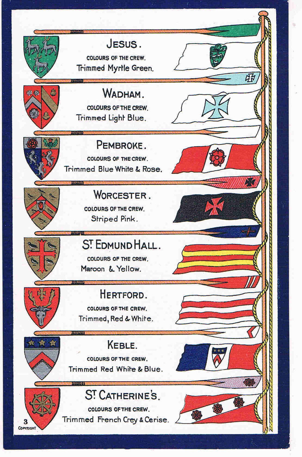 Pre-1914 postcards showing the colours of some of the Oxford college boat clubs.