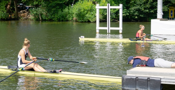 Perhaps the most under-appreciated people at the regatta are the boys who hold the sterns of the boats on the starting pontoons. They spend most of the day lying face down looking at the water, taking their instructions from two Stewards in the aligner’s tent.