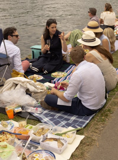 An Australian friend – visiting Henley for the first time, and armed with a fistful of Stewards’ tickets – grandly told me that picnics are not allowed in the Stewards’ Enclosure. All the more reason to leave the bounds of the blue and white awnings in search of plentiful food, and a bevy of pretty girls or handsome boys, depending upon your point of view. In actual fact, there is a lot of eating happening at Henley, and a lot of drinking as well. Pimm’s is the usual fare, but it is frightfully expensive in the enclosures. Those who picnic are definitely financially savvy.