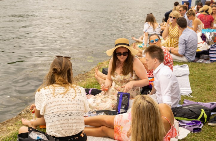 Along the bank below the Regatta Enclosure, the towpath is littered with picnics of all kind. Some are definitely well organised. I came across one group who were feasting on an assortment of chicken, ham, cold meats, pasta salad, hard boiled eggs and cheese – with champagne in real glasses to boot! Others are more haphazard. Sometime a bag of crisps and some drinks are all that is necessary.