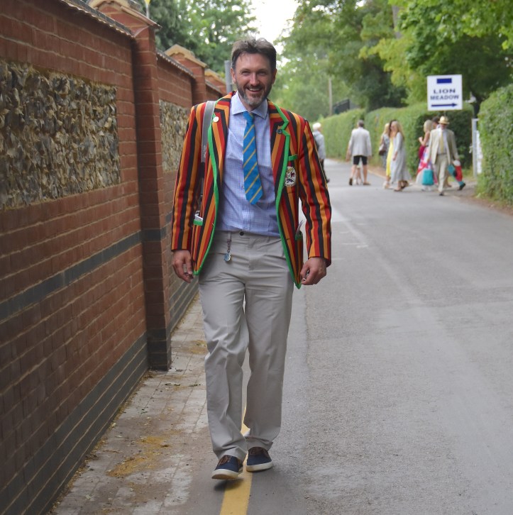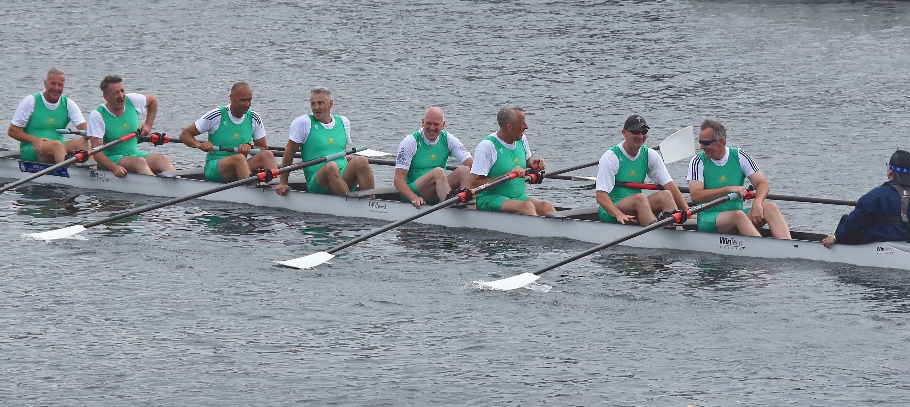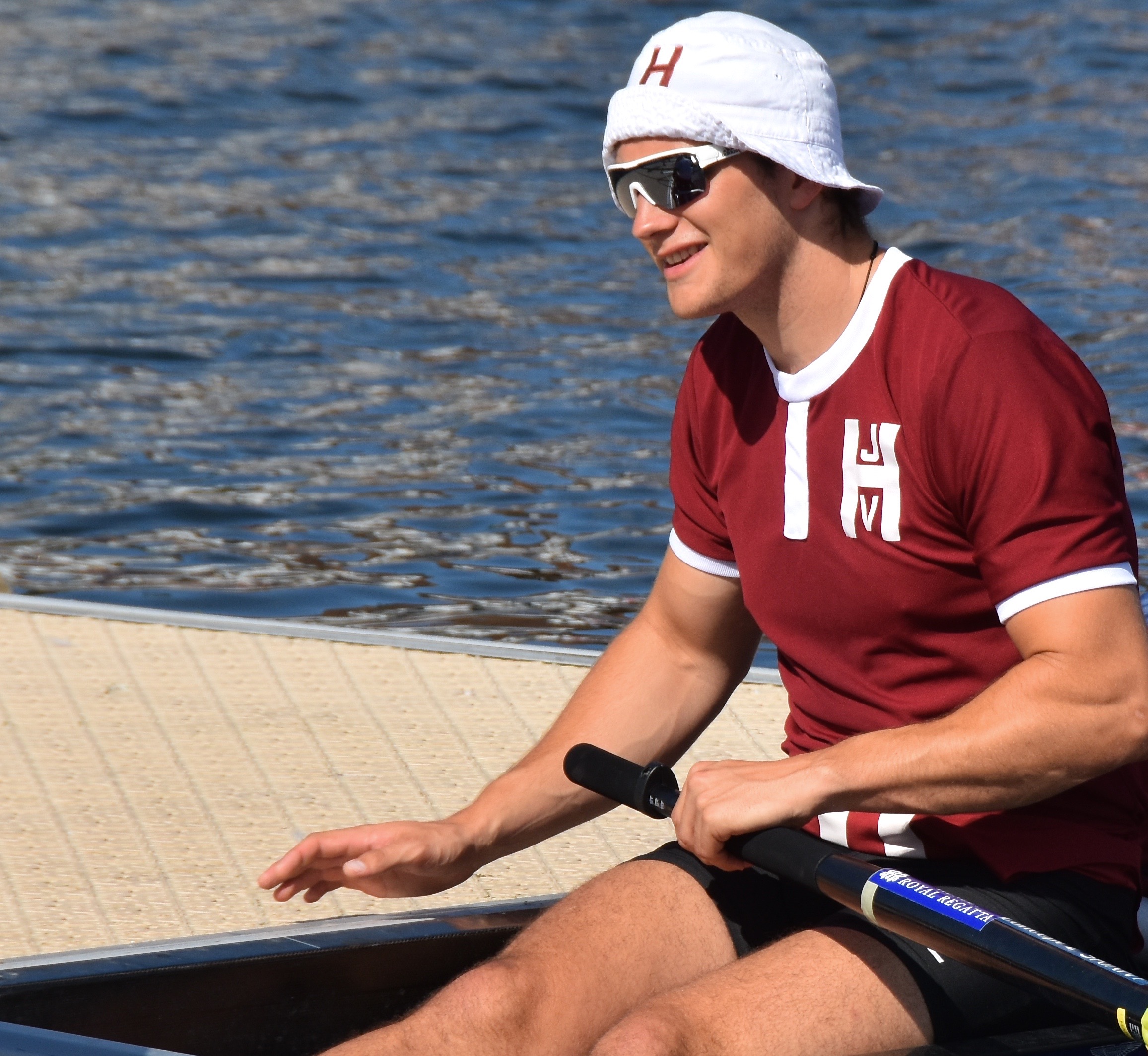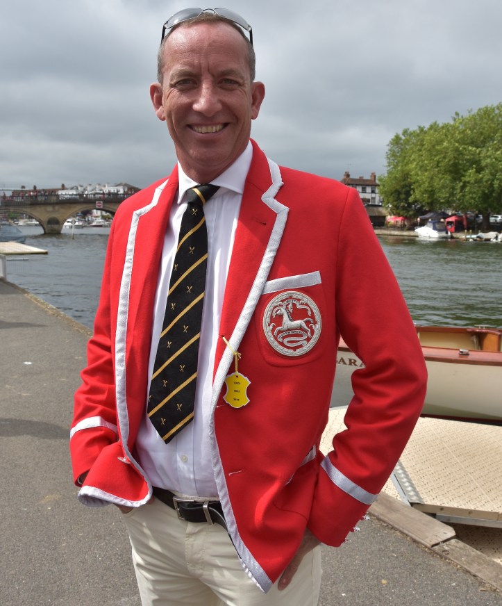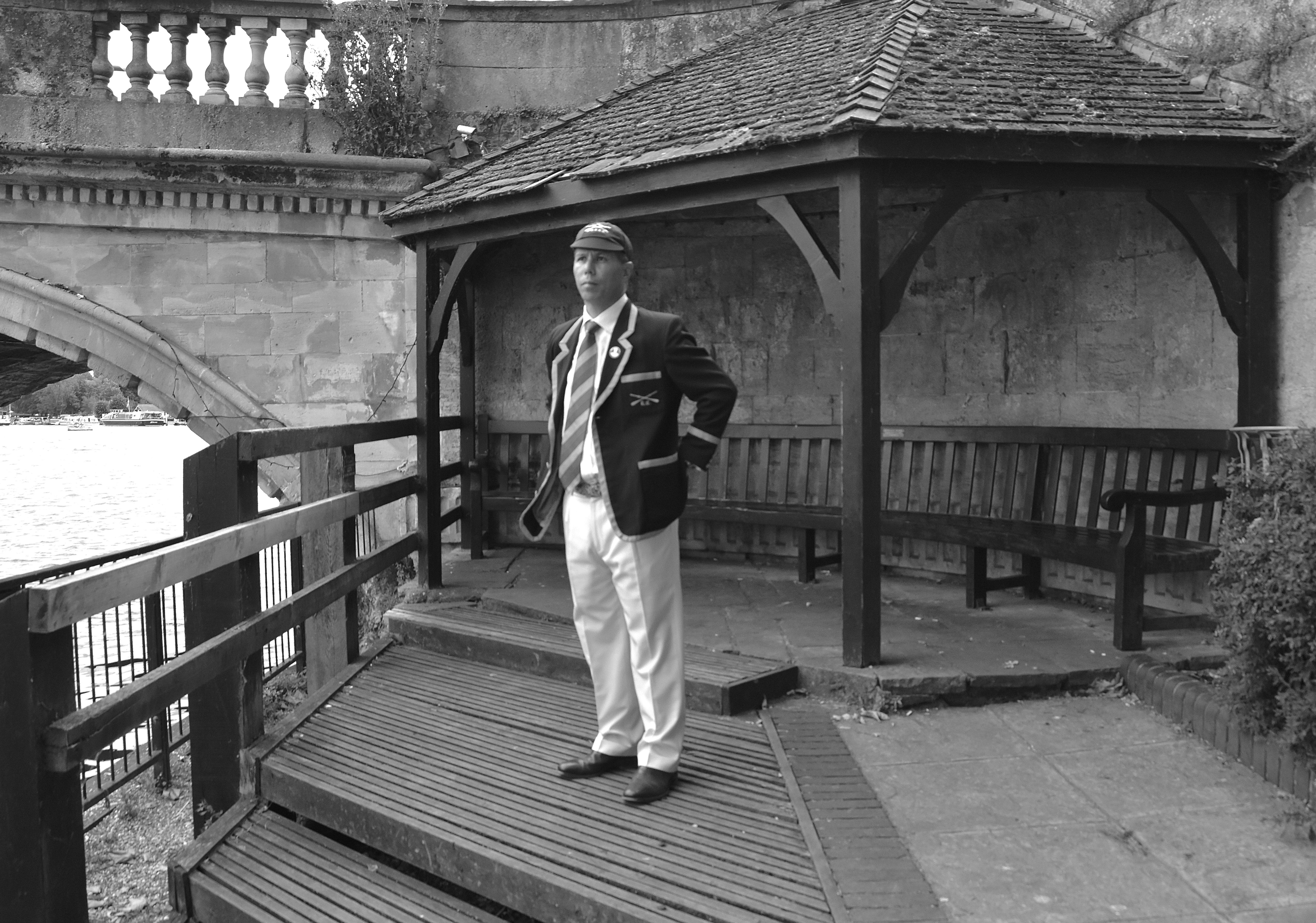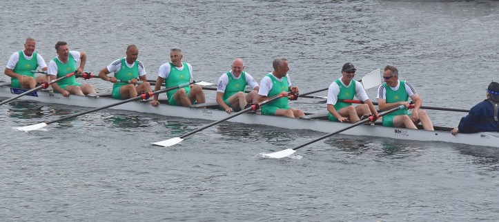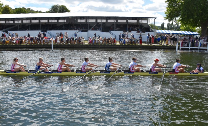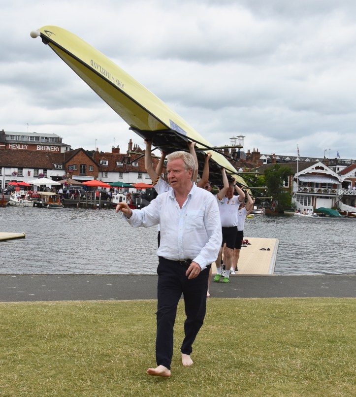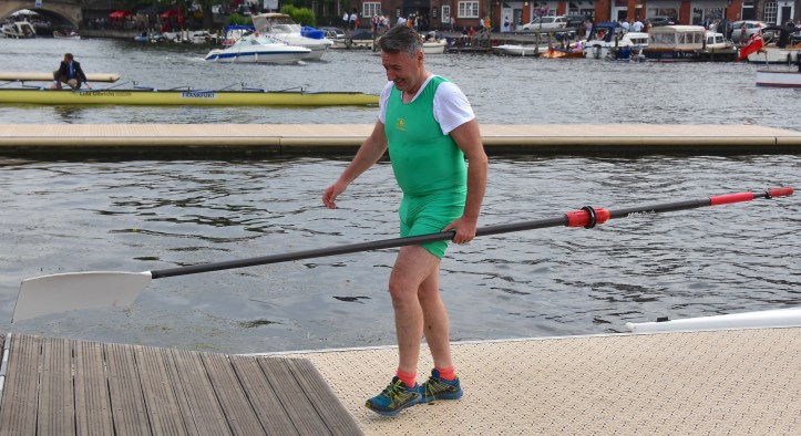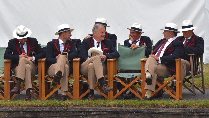 In Saturday’s fight between the last four in the Wyfolds (Club Coxless Fours), Norske Studenters Roklub, Oslo, Norway, beat Mercantile Rowing Club, Australia, by 3/4 length.Before they went out to meet Newcastle University ‘A’ in the Temple (Student Eights), the cox of Northeastern University, USA, bade each of his crew good luck (it must have worked, they won by 1/3 length).Latymer Upper School ‘A’, happy after defeating Marlow by 2 1/4 lengths in the Diamond Jubilee (Junior Women’s Quads). Later in the day, they raced Henley ‘A’ and won by 2 1/2 lengths.A stylish pair.Twigg of New Zealand leading Dymchenko of Ukraine by 1/3 length in the Princess Royal (Women’s Open Sculls).Harvard style. The bowman of the Crimson’s Prince Albert crew.Leander and Imperial College going to the start to race University of London and Molesey Boat Club in the Remenham (Women’s Open Eights). Leander and Imperial won by 1 2/3 lengths.A comparatively new phenomenon – a Doggett’s Coat and Badge blazer.In a semi-final of the Stonor (Women’s Open Double Sculls), Lu and Wang of the Chinese National Rowing Team beat Baer and Richter, Germany, by 1 length.Lu (bow) and Wang (stroke).The Marlow girls after their defeat by Latymer Upper School in the Diamond Jubilee.Hollandia Roeiclub clearly gaining no pleasure in beating their countrymen, ASR Nerus and RSVU Okeanos, in an all-Dutch semi-final of the Town Cup (Women’s Open Coxless Fours). Hollandia equalled the Barrier record, set a new Fawley record by one-second and broke the course record by four seconds.Steward Mike Williams in Goldie blazer and Trinity Hall, Cambridge, cap.Oxford Brookes show some muscle in their Ladies’ Plate (Men’s Intermediate Eights) race against the British U23 eight, racing as Cambridge University and Newcastle University. Brookes equalled the Fawley record and had a one-length win.Lord Moynihan in impromptu coxing kit with an old boys’ eight from his former school, Monmouth. They rowed past during the Saturday lunch interval to mark the boat club’s 150th anniversary. As Colin Moynihan, he was a double Blue at Oxford, coxing the victorious 1977 Boat Race Crew and boxing against Cambridge Bantamweights. Later, he steered the British eight that won Silver in the 1980 Moscow Olympics and was Minister for Sport in 1987 – 1990.Oyen and Steenman of Hollandia Roeiclub are applauded by fellow oarsmen while in the process of beating Ball and Ballinger of Leander by 3 1/2 lengths in the Silver Goblets (Men’s Open Coxless Pairs).A more civilised way to row (or scull) at Henley.An event that was always going to be noisy – Eton against Shiplake in the ‘PE’ (Princess Elizabeth, Men’s Junior Eights). Eton beat their highly rated rivals by one length.Simple and elegant, appropriately dressed for a summer garden party – Henley style at its best.Baer and Richter pass one of the delightful boathouses opposite the finish.Photographer, filmmaker, rower and coach, Hamish Roots. Check out his work on Instagram.Maroon v Burgundy. In one of the best races of the regatta, Harvard was behind Oxford Brookes for most of this semi of the Prince Albert (Student Coxed Fours) but the Americans rowed through the Brits in front of the Stewards Enclosure to win by four feet.Members of the Green Lake Crew, USA, find a good viewing point near the finish.The end of the row past by the 1989 winners of the Ladies’ Plate – Nottinghamshire County Rowing Association. Chris Dodd told the story of their famous re-row in his recent post.The ‘2’ man of the Notts County Crew, Peter Haining, one of the sport’s great characters. In 1990, when he was persistently late for training in the eight, his coach pushed him into single sculling. Three years later, he was World Lightweight Sculling Champion, a title he won again in 1994 and 1995.Some dapper gentlemen. I presume the ‘RMC’ on their blazers indicates the Royal Military College of Canada, and that they are supporting that institution’s entry in the King’s Cup.This Henley, I finally had the pleasure of finally meeting HTBS contributor, William O’Chee, over on a fleeting visit from Australia. This was something that I had been looking forward to not just because he is a knowledgable fellow rowing historian, but also because he is a man of multiple interests, talents and experiences, one of those people who seem to find more than 24 hours in a day.A picture from Brasenose College Boat Club, Oxford, Archives. I posed William by Henley Bridge to match this picture of his fellow Brasenose College oarsmen, winners of the 1862 Stewards’ and Visitor’s Challenge Cups. Despite painfully slow exposure times, the Victorian photographer managed to get a sharp image of the group. One hundred-and-fifty-seven years later and using a digital camera with a 24-megapixel sensor, I failed to get William in proper focus (though it was after a good lunch in Leander…)