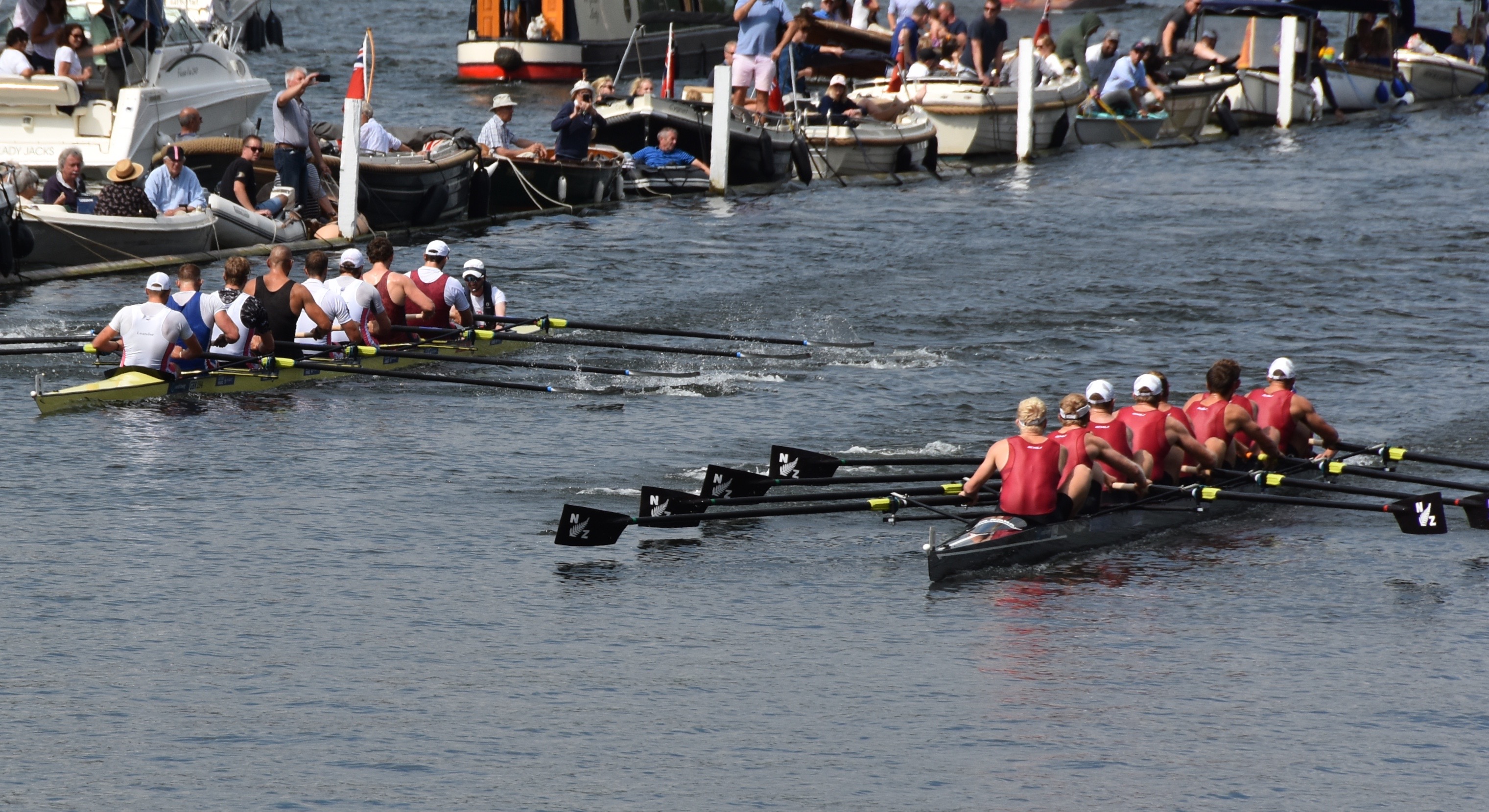 While this year’s regatta had a record-breaking entry of 660 crews entered for 340 places, pundit Daniel ‘Fatsculler’ Spring wrote ‘behind the headlines the entries in some events (particularly The Grand, Stewards and Queen Mother) are disappointingly small’. This is true but ’twas ever thus at Henley, it is the nature of the beast that international events are offered in a regatta that is not on everyone’s international calendar in the same year. This is reflected in some of the wide winning margins in the Open events. However, in the case of the Grand particularly, there have, at times, been some thrilling races involving only two entrants. Conversely, the Queen Mother has not produced much excitement in recent years and should perhaps be renamed the ‘Give Leander More Henley Medals Cup’.