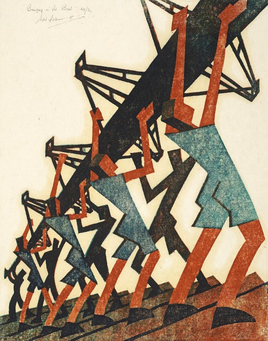 The exhibition includes work by Sybil Andrews, Claude Flight, Lill Tschudi and William Greengrass, among others. Popular subjects were rural life, transport, the wartime London Underground, large assemblies at places such as concert halls and examination rooms and sport. Power and Andrews, who lived within a short walk of the river at Hammersmith, depicted rowing, skating, tennis and other sports, and their linocuts are particularly representative of rhythm and movement that this group display in their work.