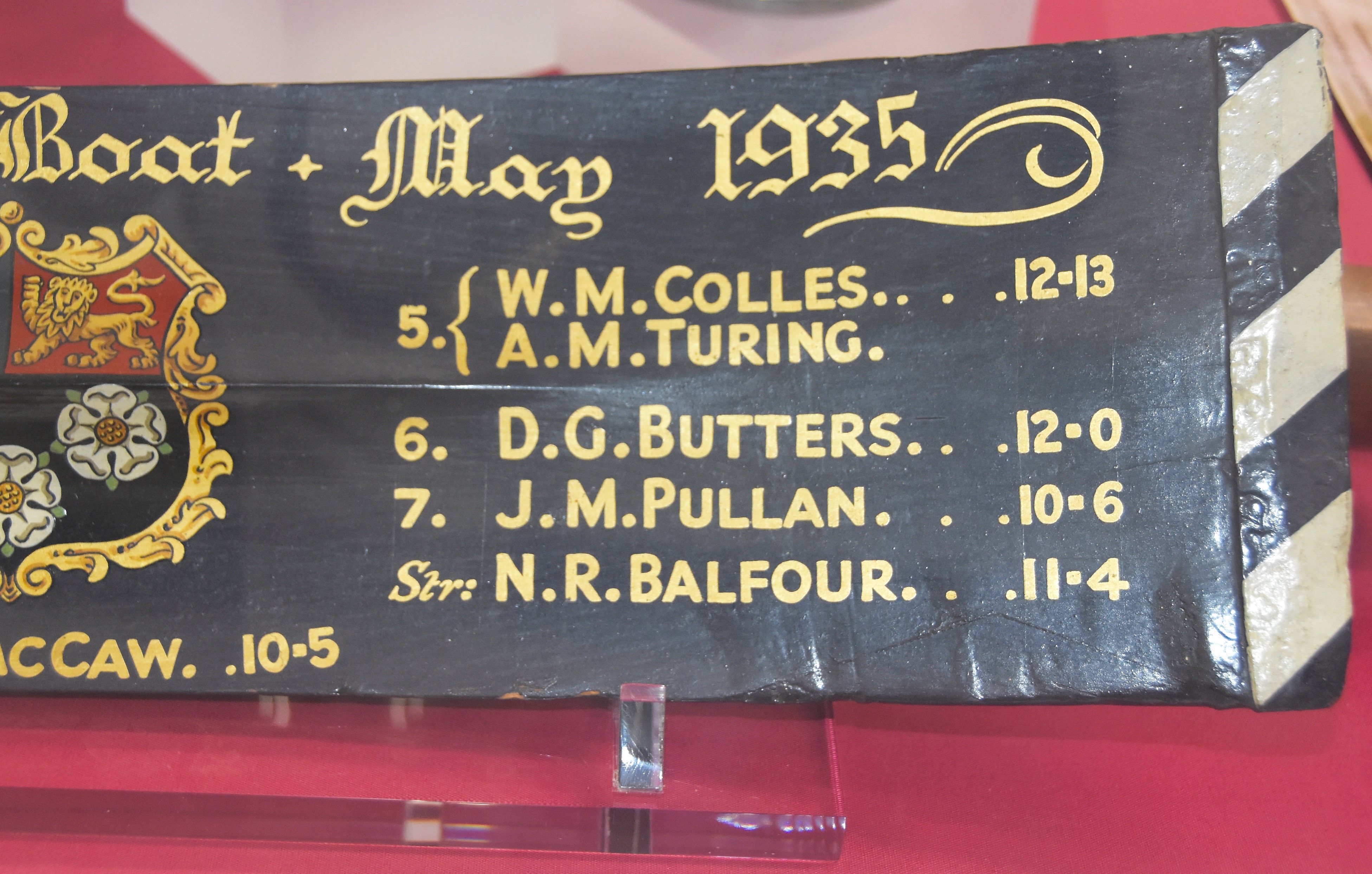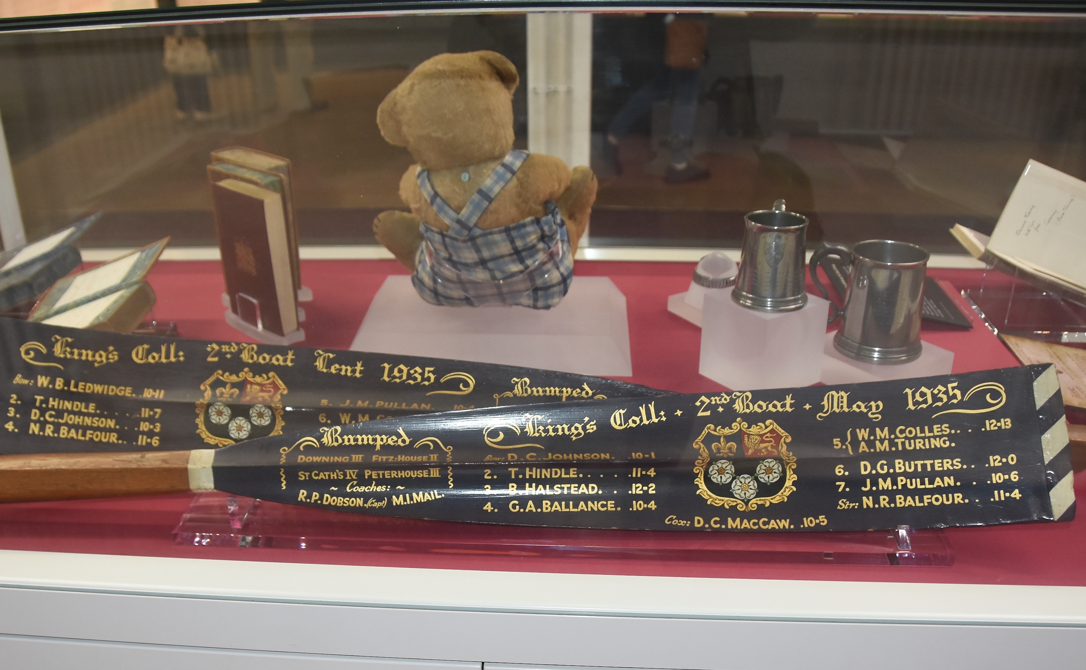 Turing took up rowing when he went up to King’s College, Cambridge, in October 1931 as a mathematical scholar. Alan was first reserve in the 1934 second eight but did not row. However, he was reserve again in 1935 and got to row in the Mays when ‘5’, WM Colles, broke a foot. The blades are for King’s Second Boat in the Lent and the May Bumps of 1935.